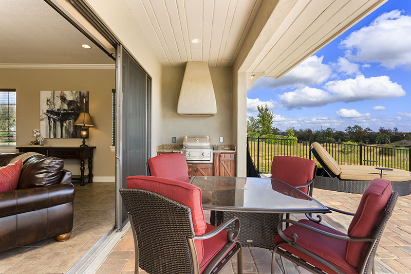 The pool deck includes a covered lanai, with a six seat patio table offering a spectacular elevated vantage point overlooking the golf course.