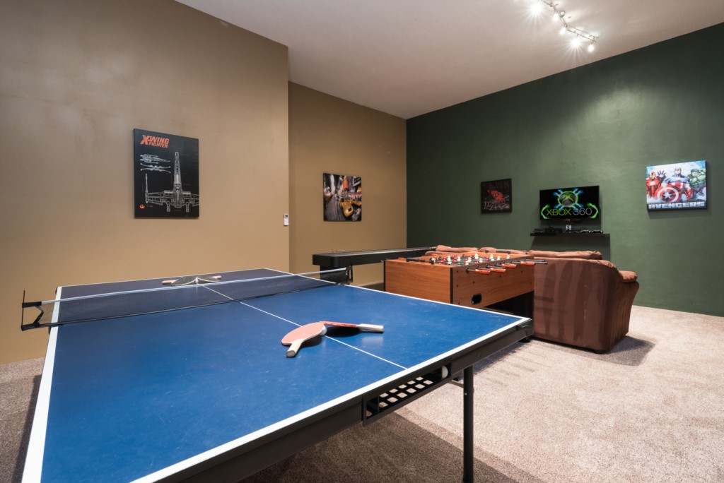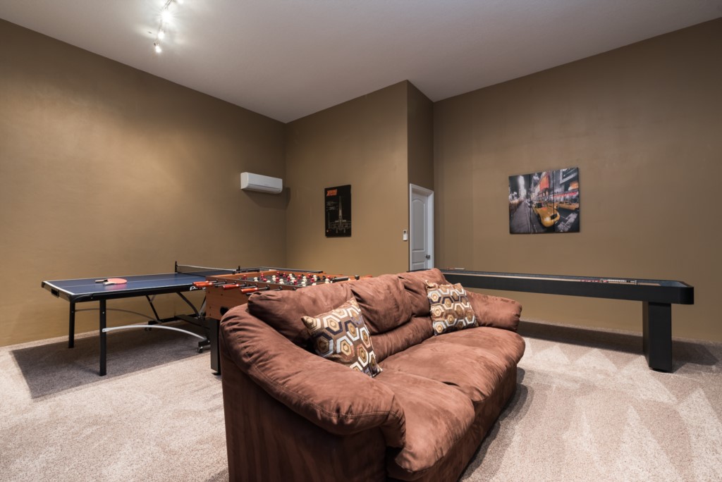 The ground floor level of this home is all about the living space and incorporates a formal dining area, fully equipped kitchen complete with stainless steel appliances, granite counter tops and a huge granite island and breakfast bar which provides ample casual dining space. The Kitchen overlooks the family seating area with comfortable sofas, accent chairs, a large wall mounted flat screen TV and work station with one wall having glass sliding doors opening onto the pool deck. There is a full laundry room, pool bathroom with a walk in shower and games room offering a table tennis table, airhockey and comfortable seating.