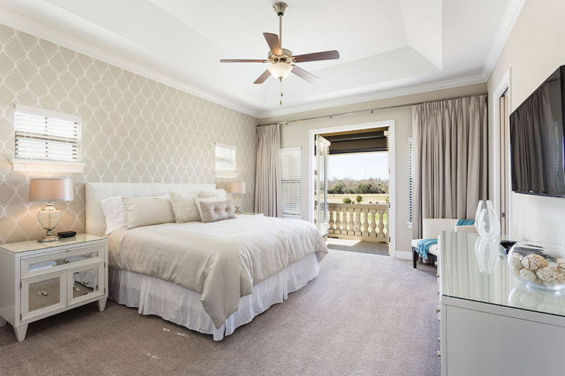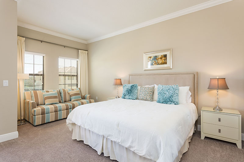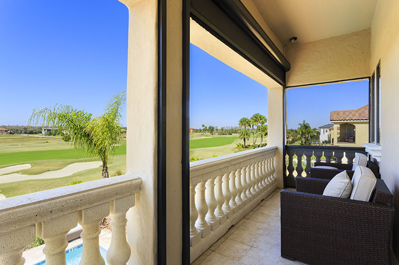 Upstairs is a loft area providing a second living space with comfortable seating perfect for the children to enjoy hours of fun with the wall mounted TV and X box. There are four further bedrooms, one to the front of the home is a king-size suite having a bathroom with walk in shower and private balcony overlooking the front of the home. Along the landing are two further bedrooms one having two twin beds and the other a queen-size bed with both bathrooms having a tub shower combination. To the rear is the third king-size master suite with a beautiful bathroom incorporating a corner tub, walk in shower, and twin vanities. This bedroom has the advantage of a private rear balcony overlooking the pool deck below and the adjoining golf course but having the advantage of viewing the most spectacular sunset views making this the prefect spot for unwinding at the end of the day with a cocktail. The stairs have a fitted baby gate.