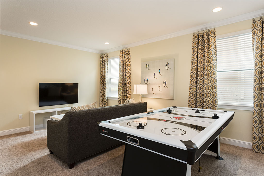 Large Smart TV, poker table, air hockey table and comfortable seating in the loft area