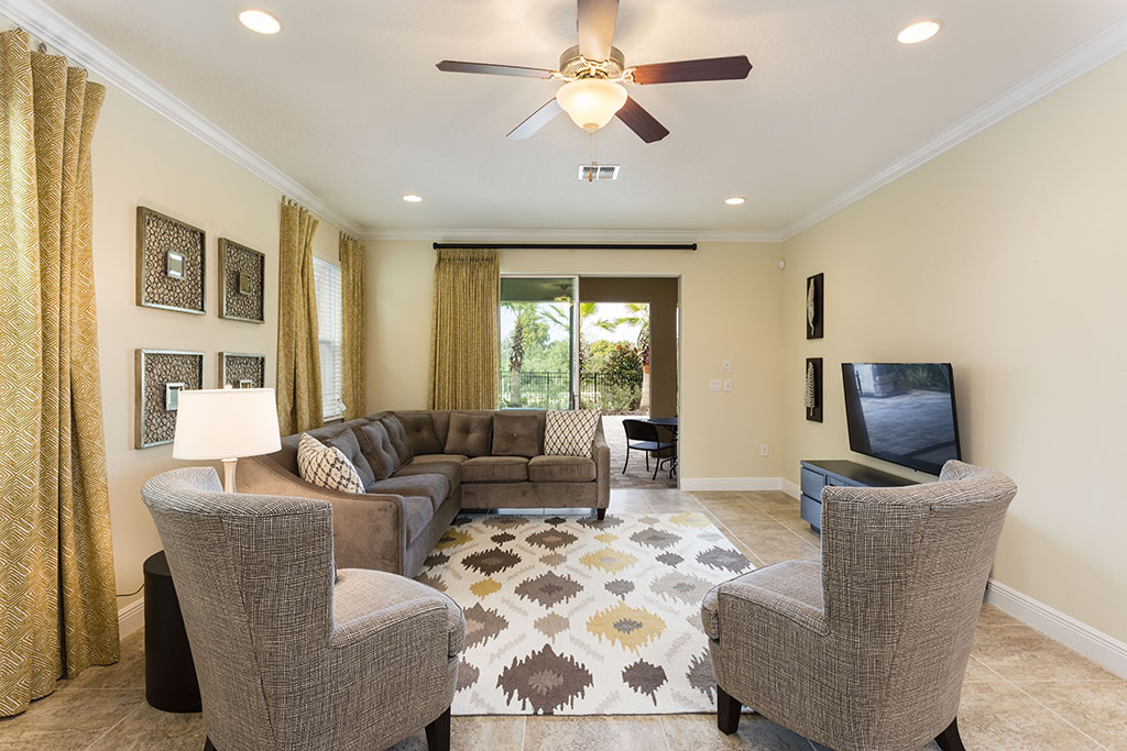 With views over the pool deck, the family living area includes comfortable seating, sectional sofa and a large flat screen TV.