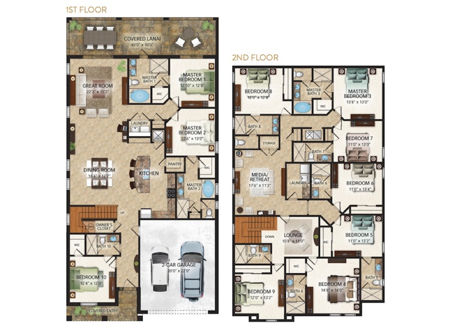 Providing 4724sq ft of air conditioned living space, the Fremont II offers three fabulous king sized master bedroom suites, 6 king bedroom with private en suite bathrooms and a spacious king sized bedroom with nearby bathroom. The gorgeous covered lanai and pool deck awaits!
