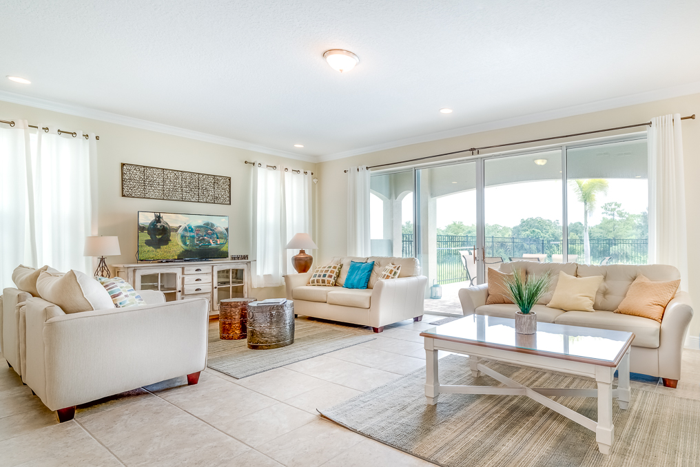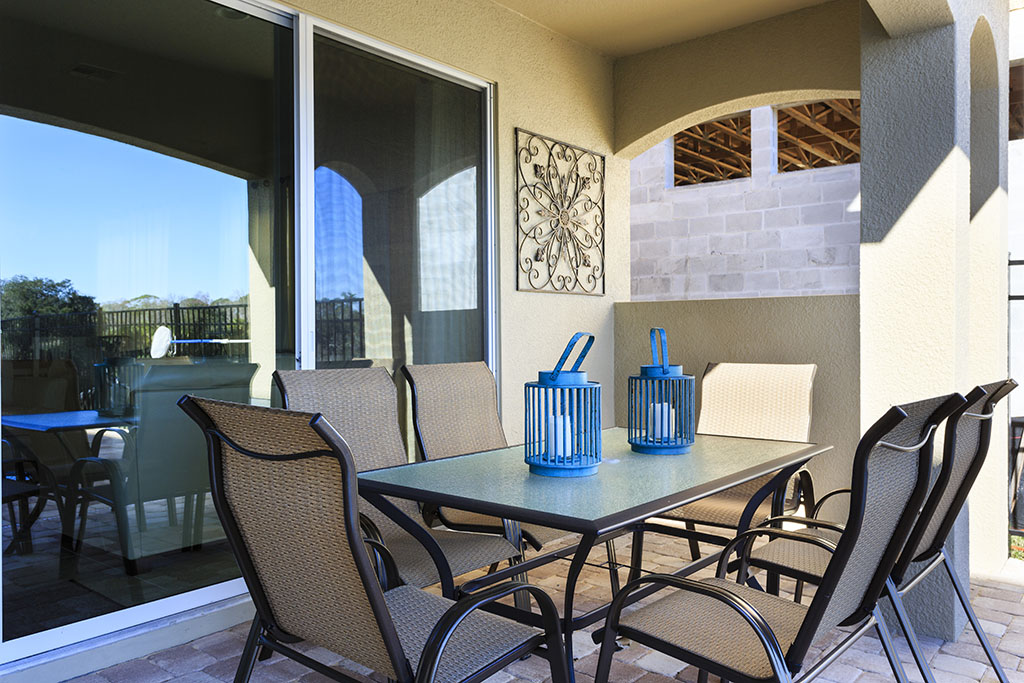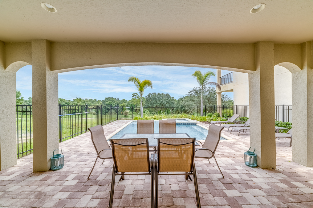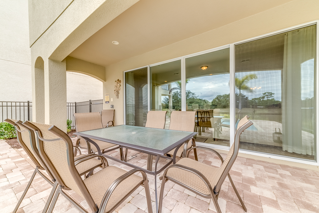 The covered lanai adjoins the home through the large panoramic glass sliding doors, providing the perfect place to relax in style and enjoy the warm Florida air throughout your stay.