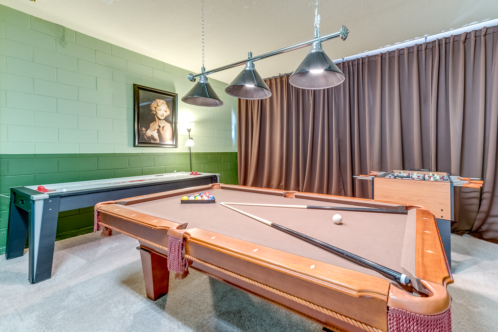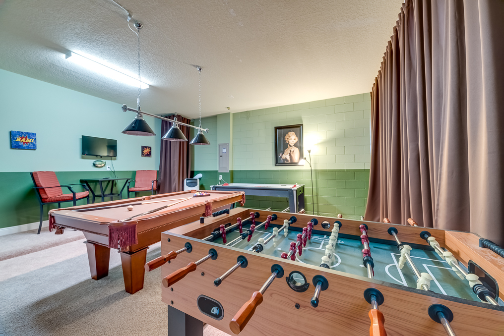 A well equipped games room offers foosball, pool table and air hockey, along with a table and stools.