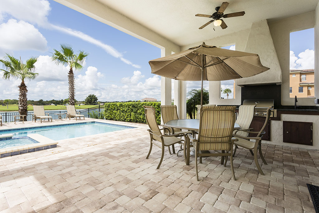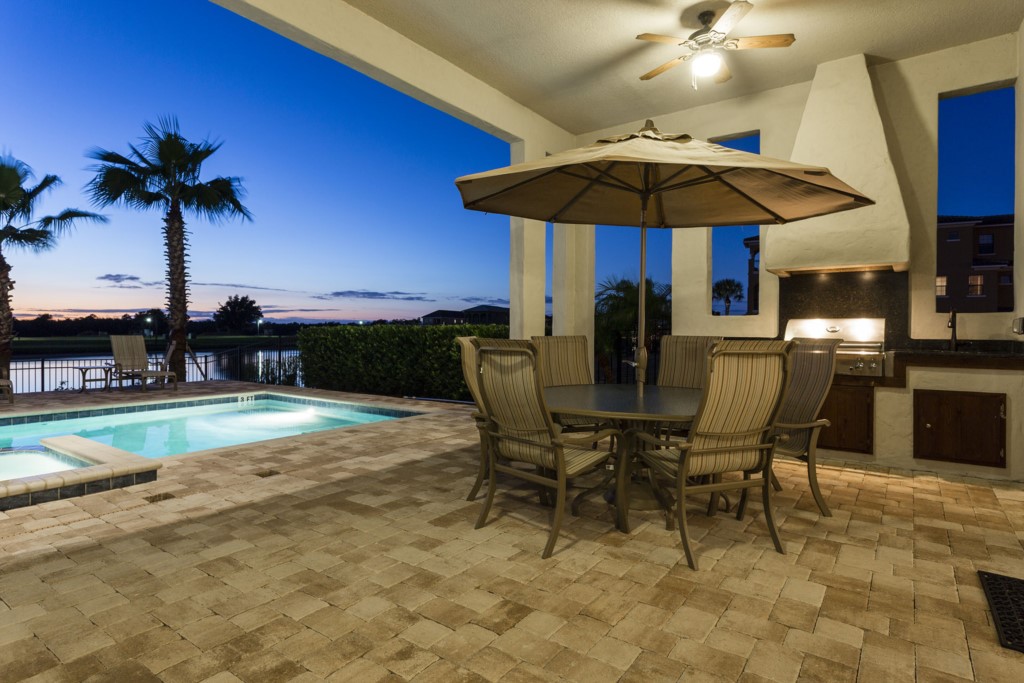 - Outdoor kitchen includes gas BBQ grille, sink and fridge to keep your refreshments nearby.