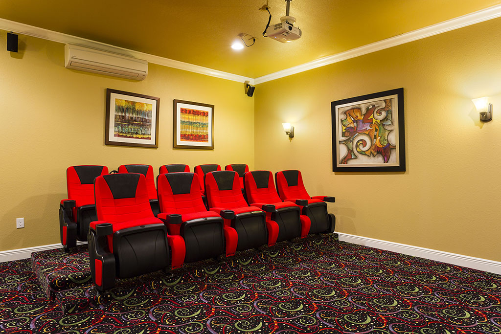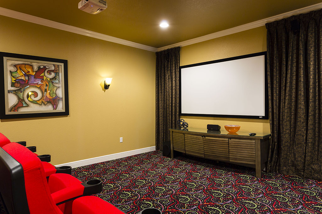 - 10 seat, tiered home theatre area with 92” projection screen TV, Blu-ray player and surround sound.