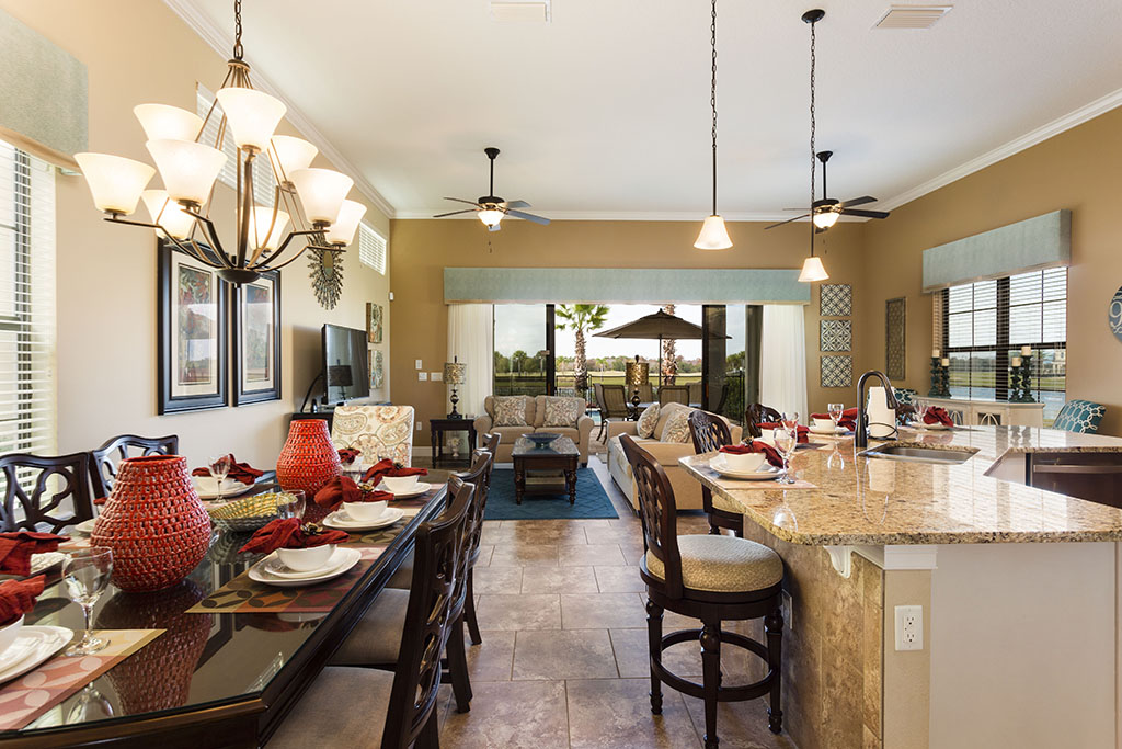 - Open layout includes fully equipped kitchen, dining table with seating for 8, island seating for 4, and comfortable TV lounge area all overlooking the pool deck.