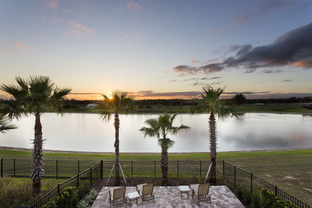 - Private balcony with pool and lake views.