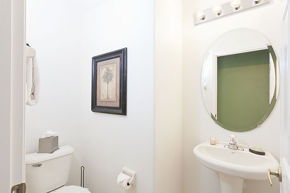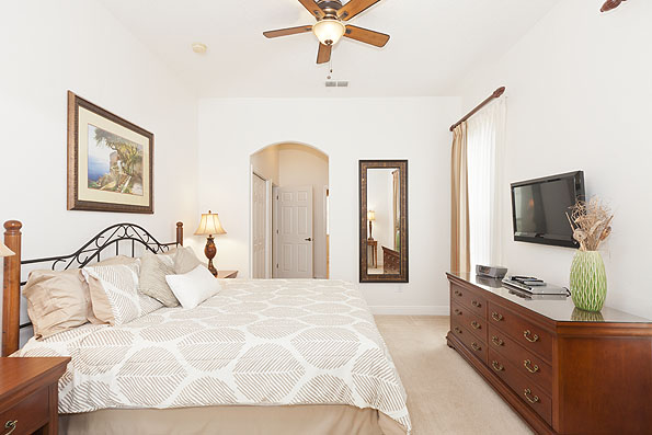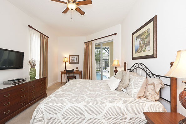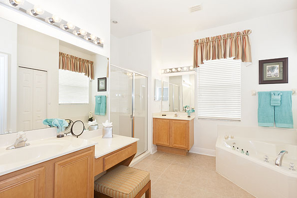 The owners of this beautiful home have just completely redecorated the interior replacing many of the furnishings to create a modern relaxing family home. The downstairs living area is an open plan with the vaulted ceiling creating a spacious and bright feeling. There are both formal and family dining areas. These are separated by the fully fitted kitchen, complete with a breakfast bar. The family area has a large comfortable sectional sofa for viewing the large flat screen TV with access to the pool deck. The full equipped laundry room offers access to the newly converted games room which has a table tennis table, foosball table, and also basketball games guaranteed to provide hours of entertainment for the children. On one side of the house there is a guest powder room and the king-size master bedroom suite offering access onto the covered patio. The large bathroom has twin vanities, sunken tub and walk in shower.