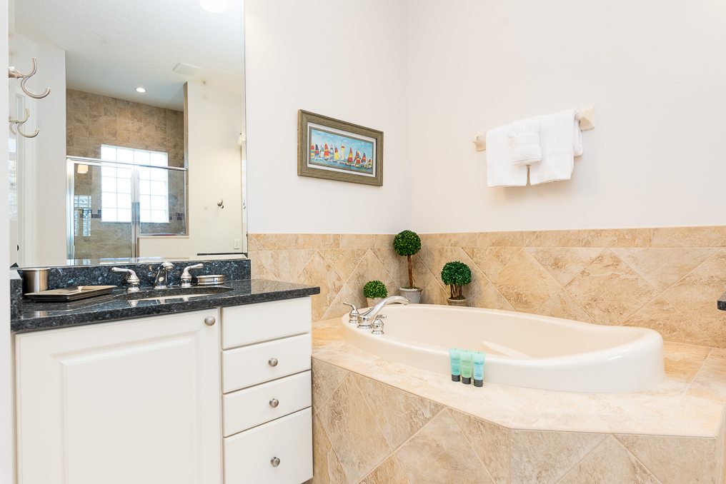 The bathroom includes a large shower, spa tub, twin vanities and WC.