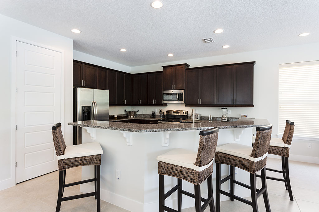 The 4 seat breakfast bar carries over that beautiful theme along with granite counter tops.