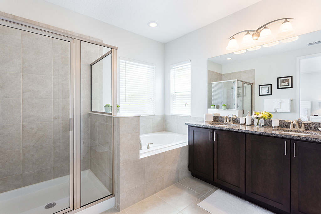 A spacious king sized master suite with seating area, shower, twin vanities and bath tub