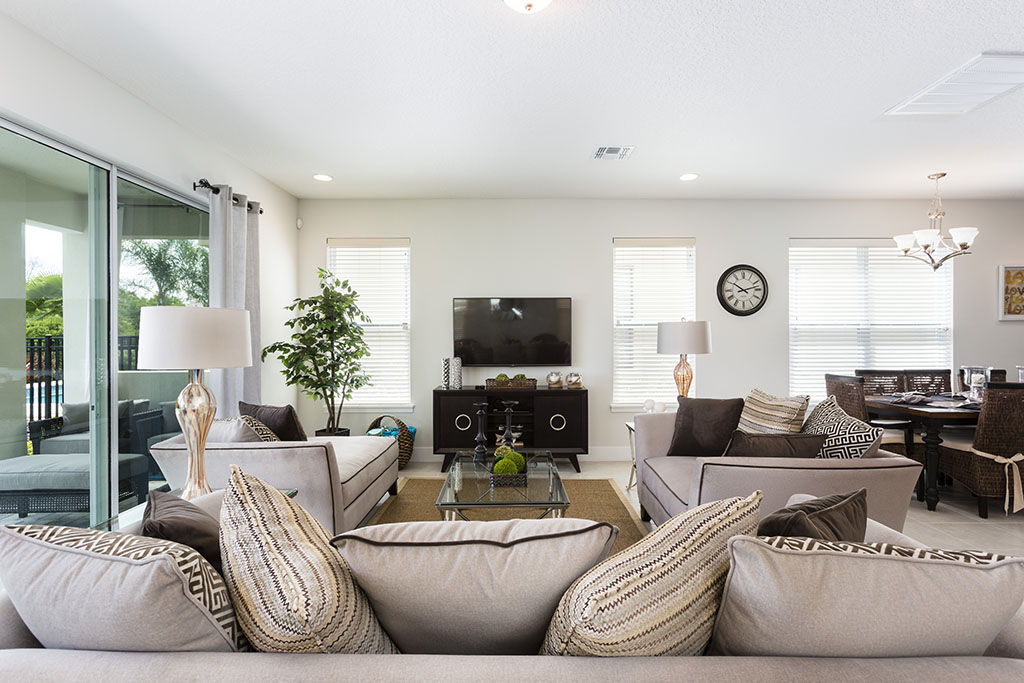 The spacious open layout of the family living area offers pool deck views through the large glass sliding doors.