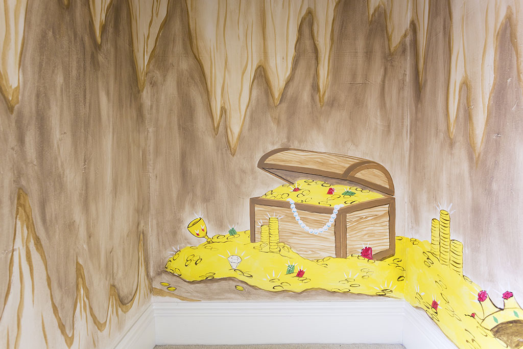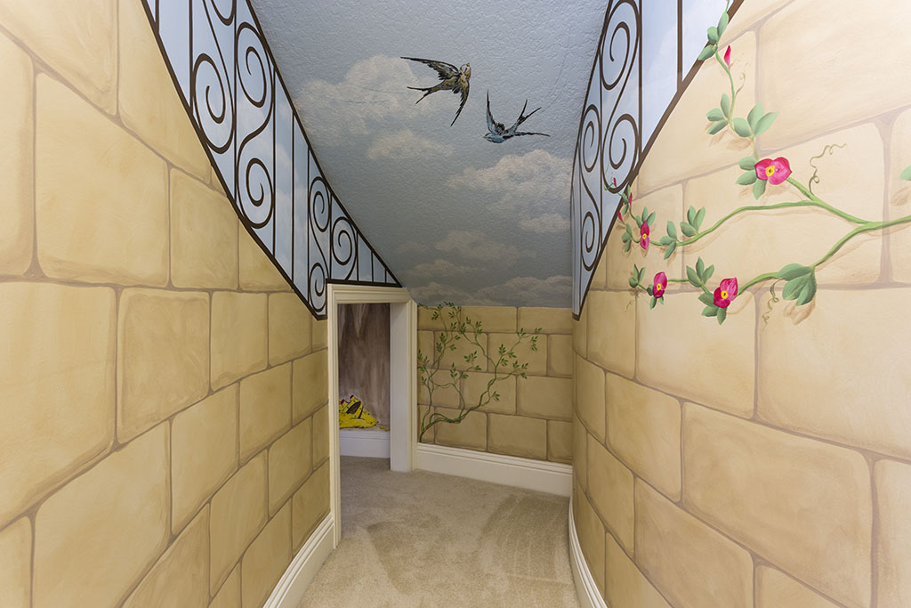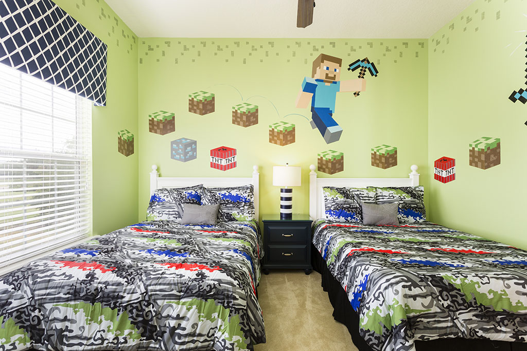 Towards the mid section of the home, a Minecraft themed room includes two full sized beds and benefits from a an ensuite with shower and WC.