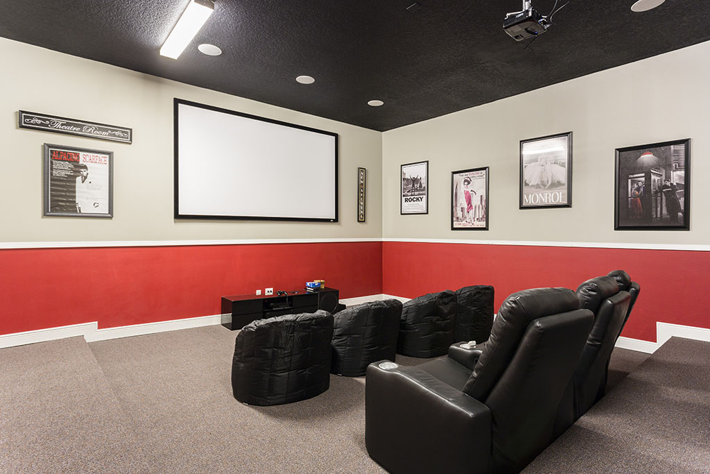 A home cinema includes 7 seats and 4 'bean chairs' for guests to relax watching their favorite movies.