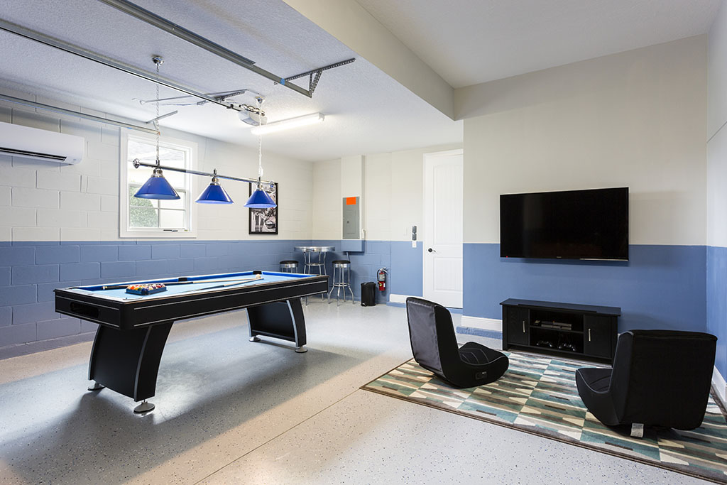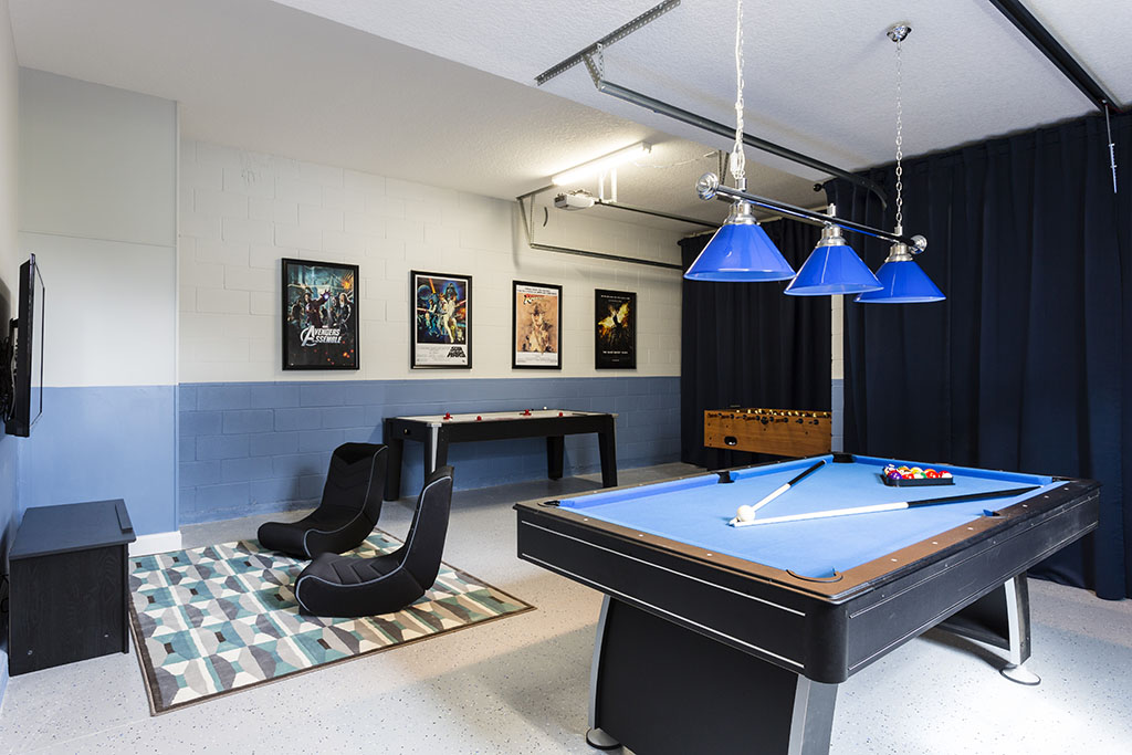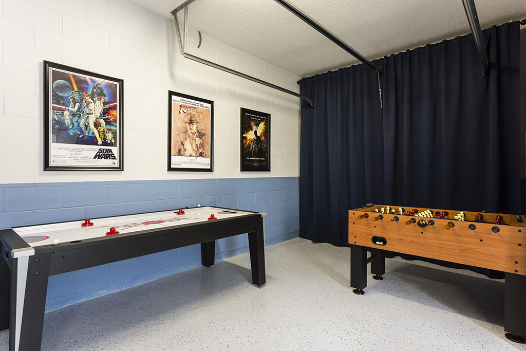 A games room includes foosball, air hockey and pool table, plus games console and bar table.