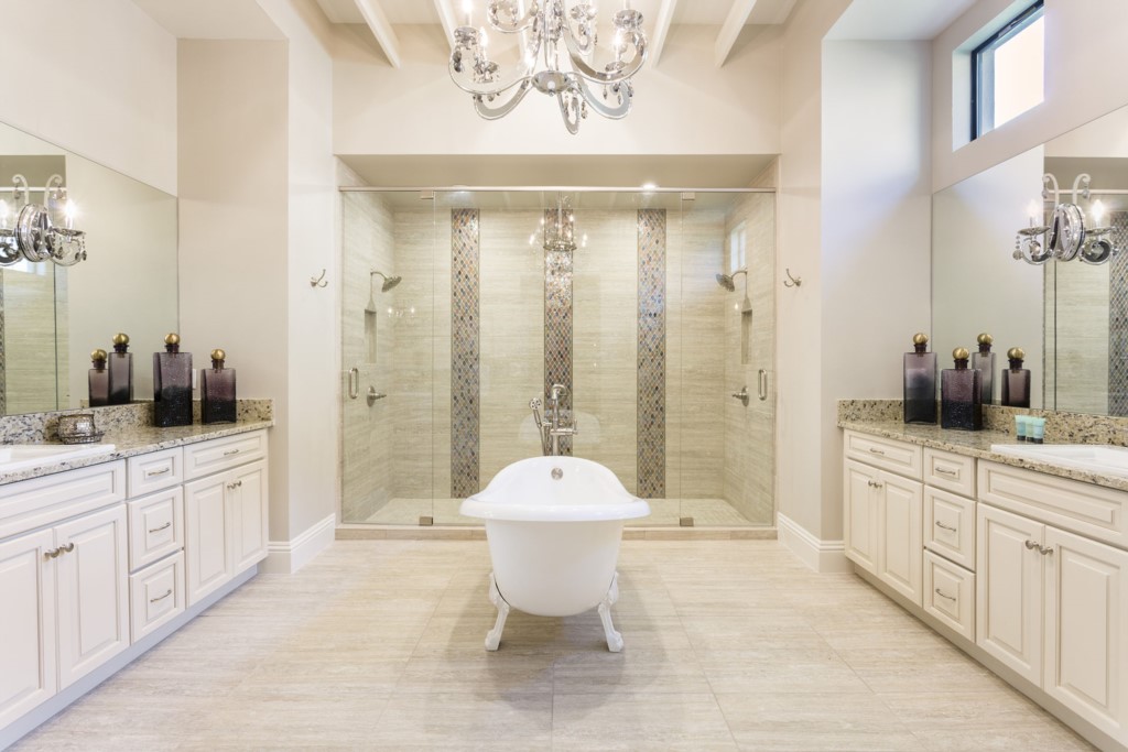 A master suite with large walk in shower, twin vanities, and feature bath