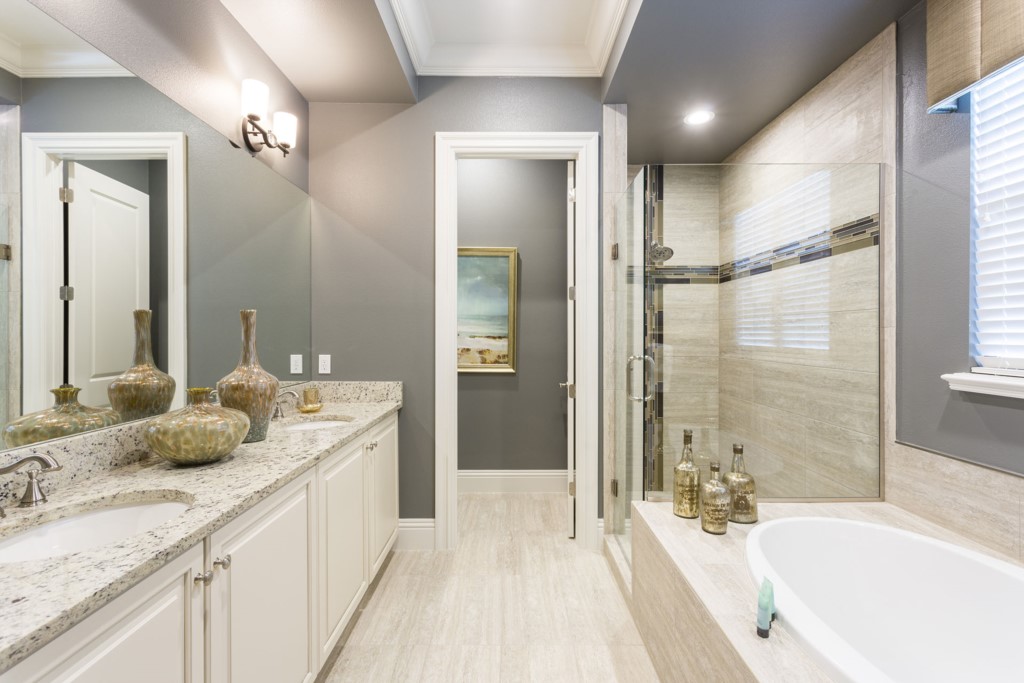 A master suite with shower, bath and twin vanities