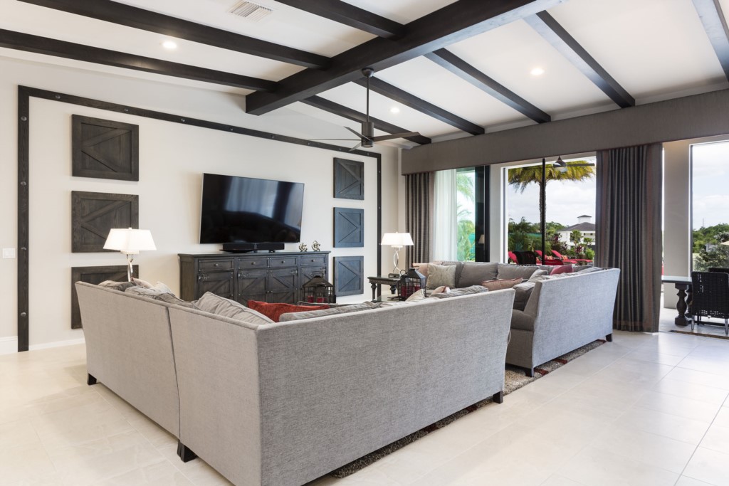 A very large great room overlooking the pool deck, includes comfortable seating, large flat screen TV