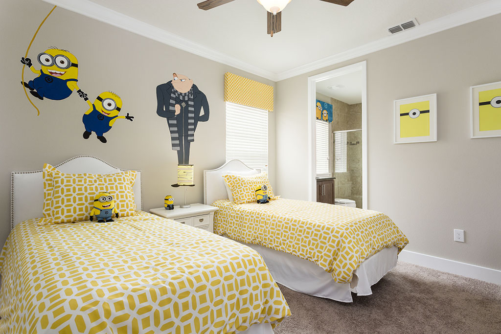 A Minion themed room includes two twin sized beds and an en suite with shower
