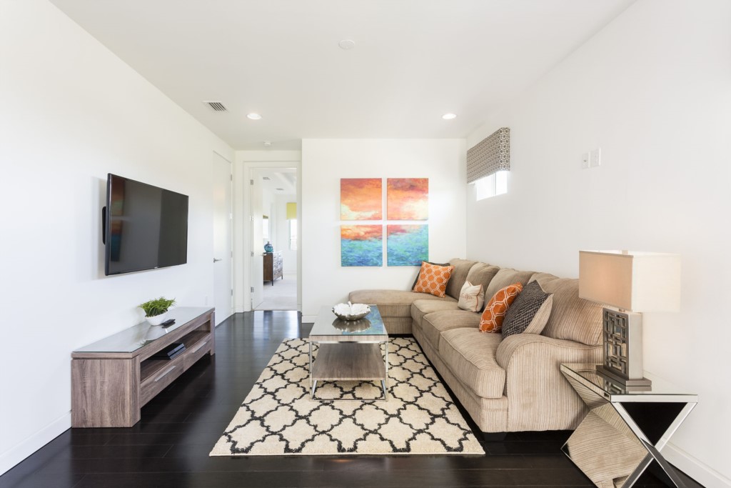 The ground floor TV lounge and living area overlooks the pool deck through glass sliding doors, and shares an open space with the fabulous, fully equipped kitchen, complete with 3 seat breakfast bar.