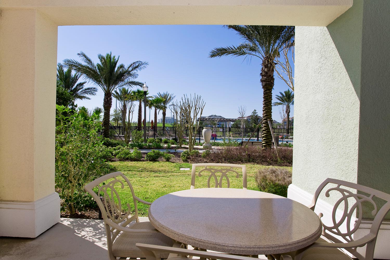 3-bedroom luxury Reunion Resort vacation condo with private patio and views of the splash pad and golf course
