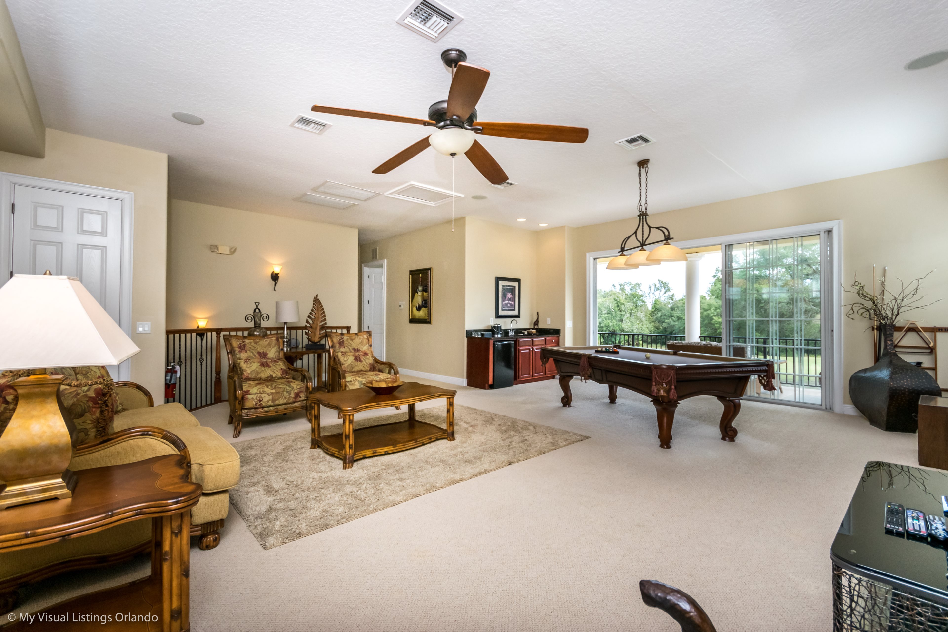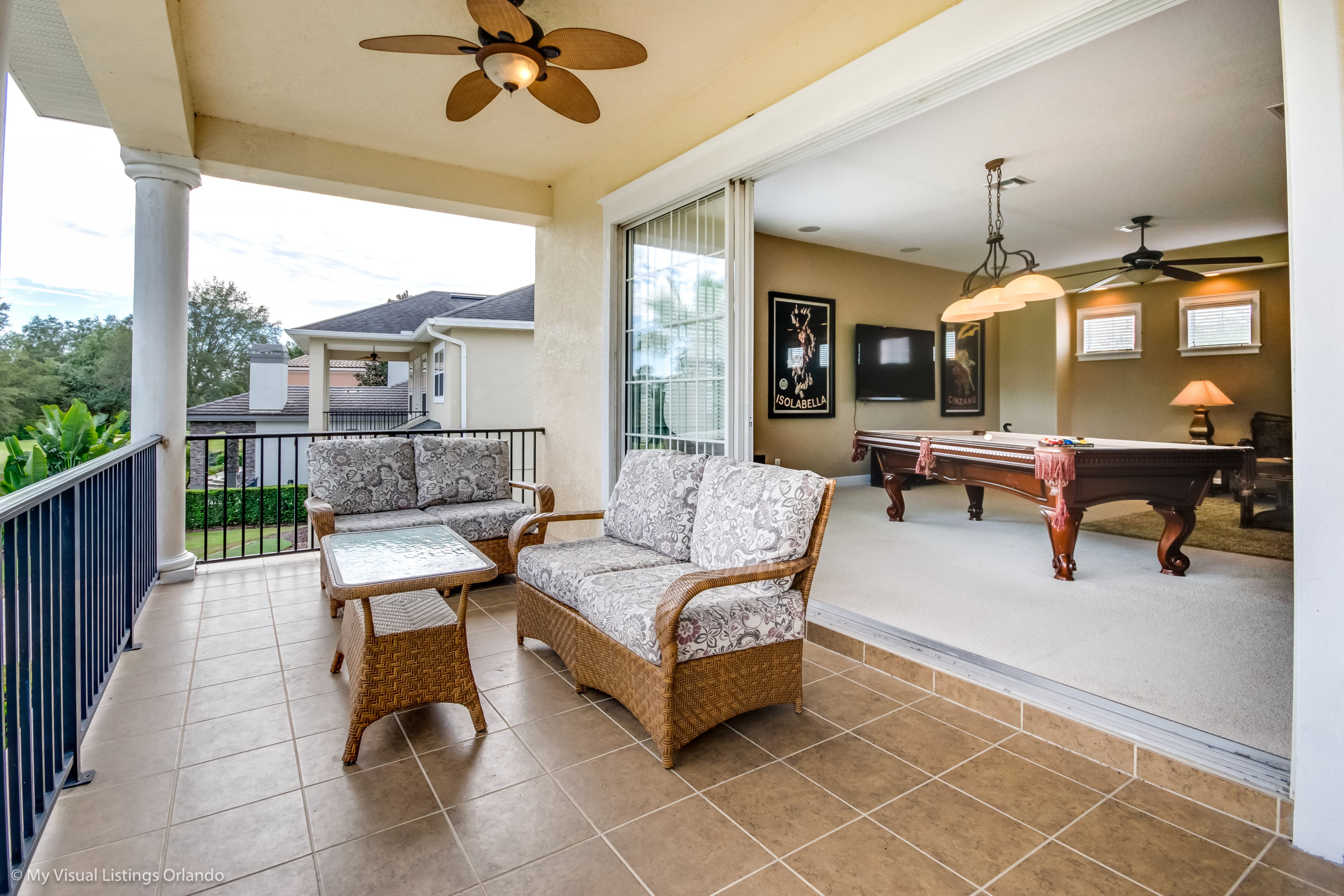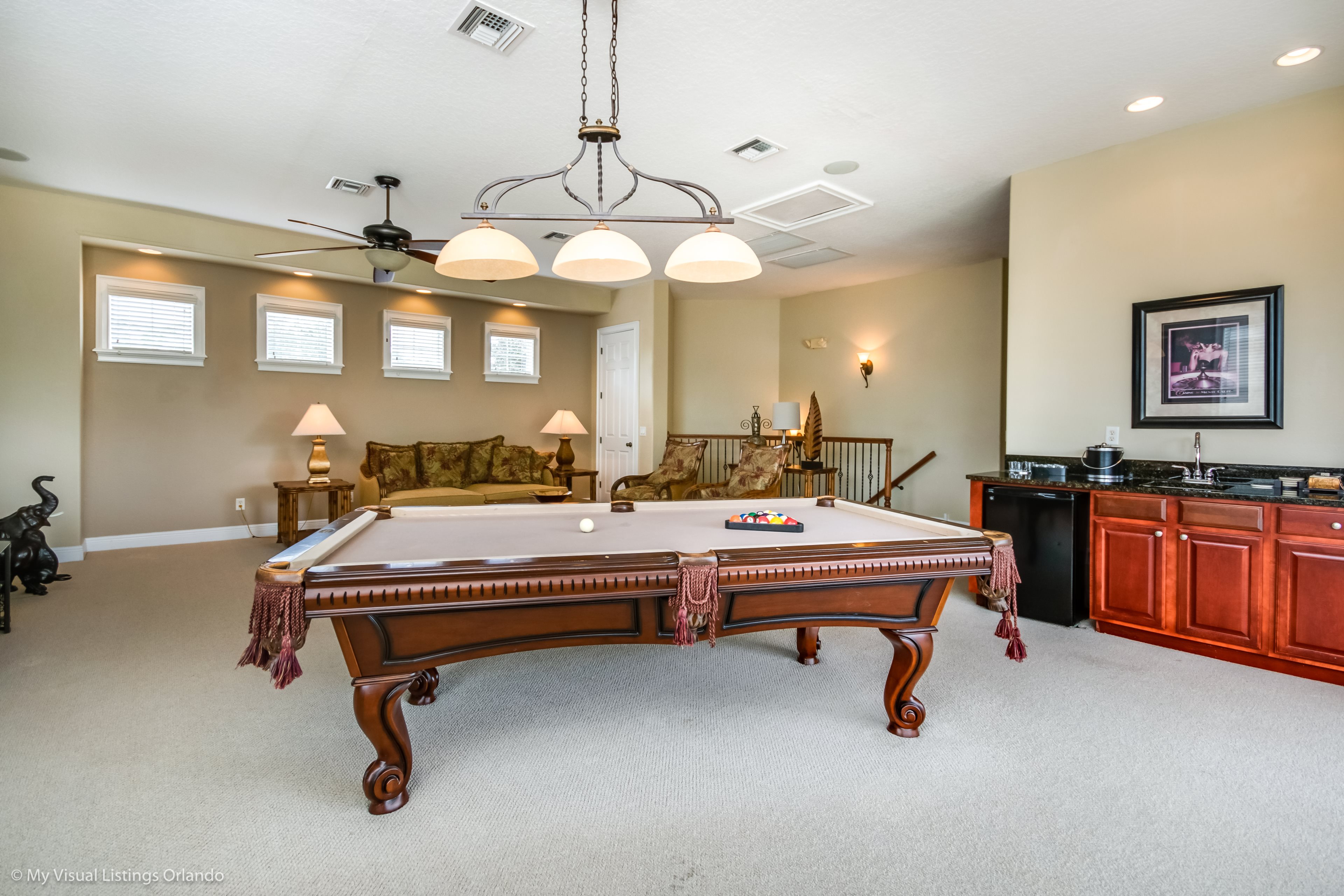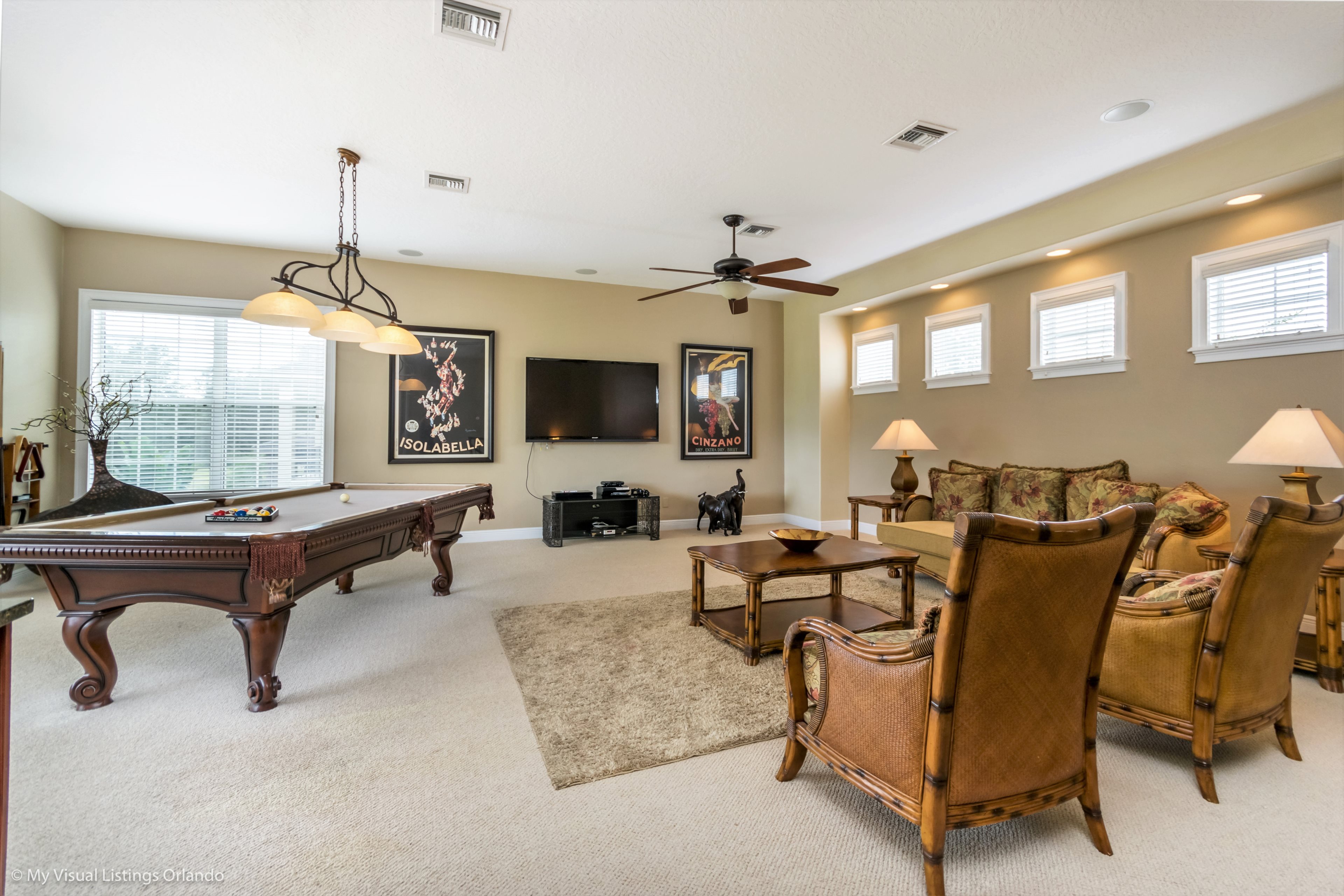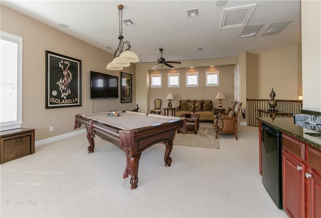 Upstairs is a large games room with comfortable sofas, pool table, large wall mounted TV complete with games console, and built in wet bar. Sliding doors access the rear balcony making this space a great space for family tournaments or simply relaxing and enjoying the great golf course views. The second king-size master has an ensuite bathroom with walk in shower. Two further bedrooms, one full size and the other having two twins share the family bathroom with a tub/shower combination.