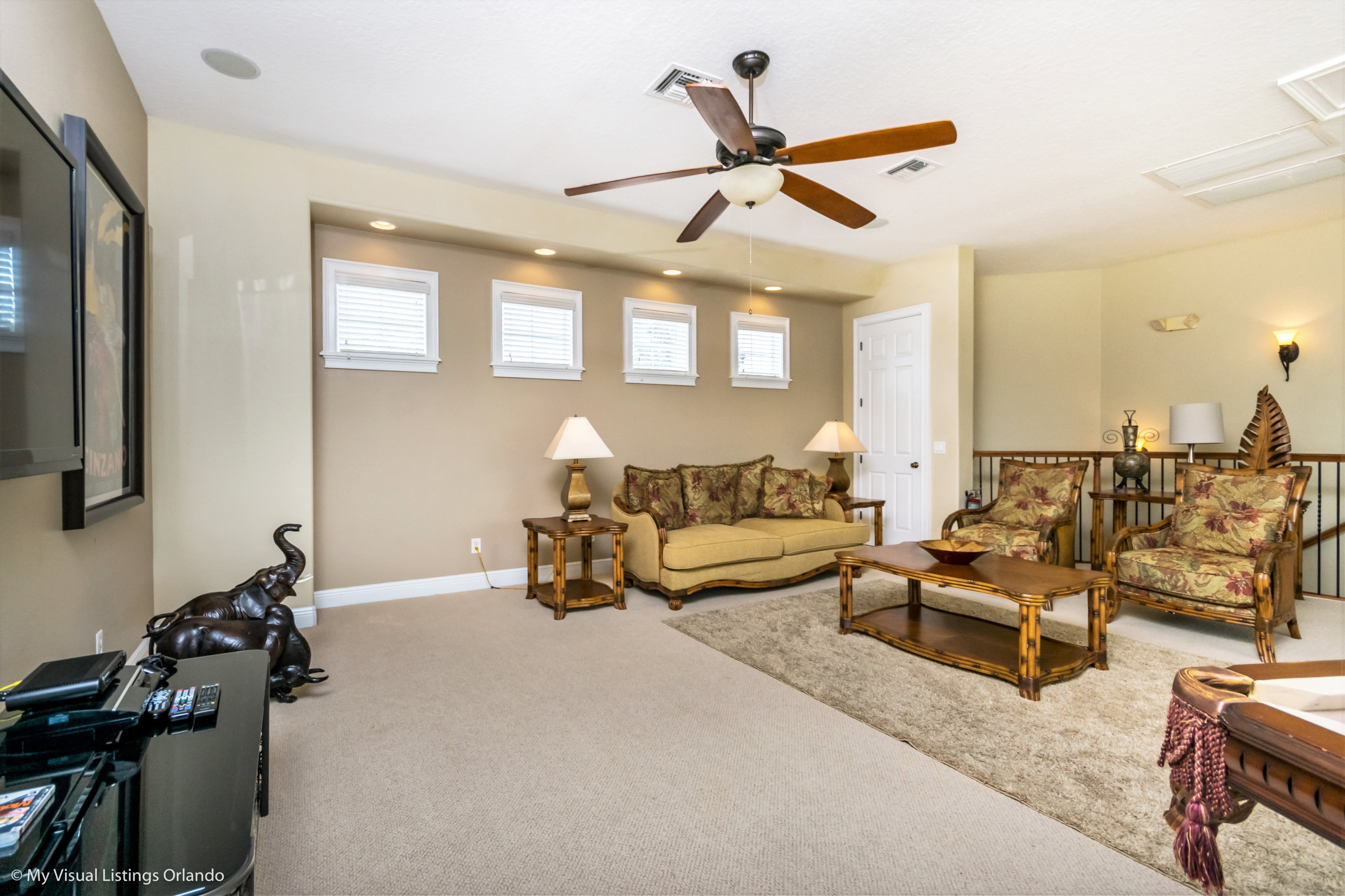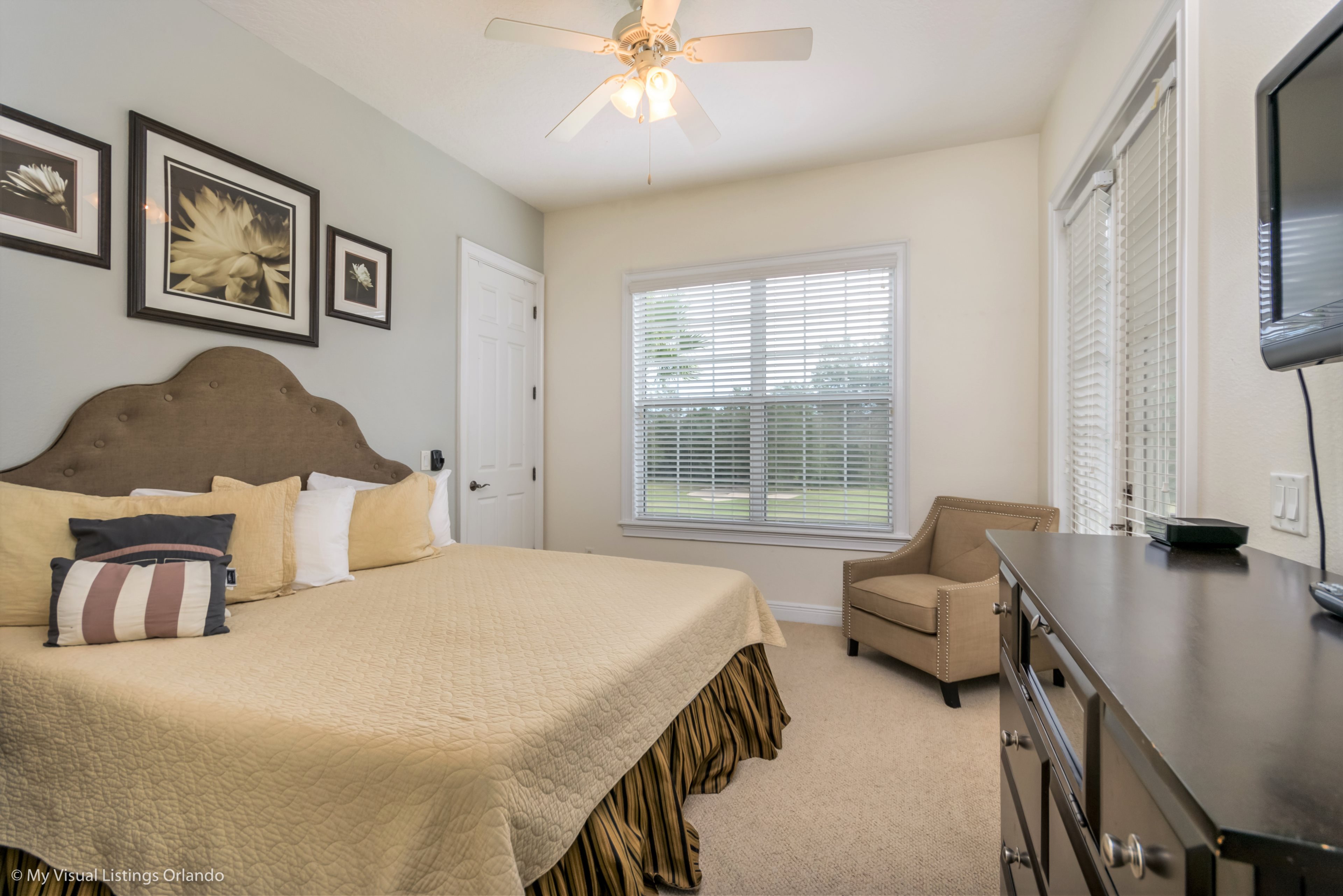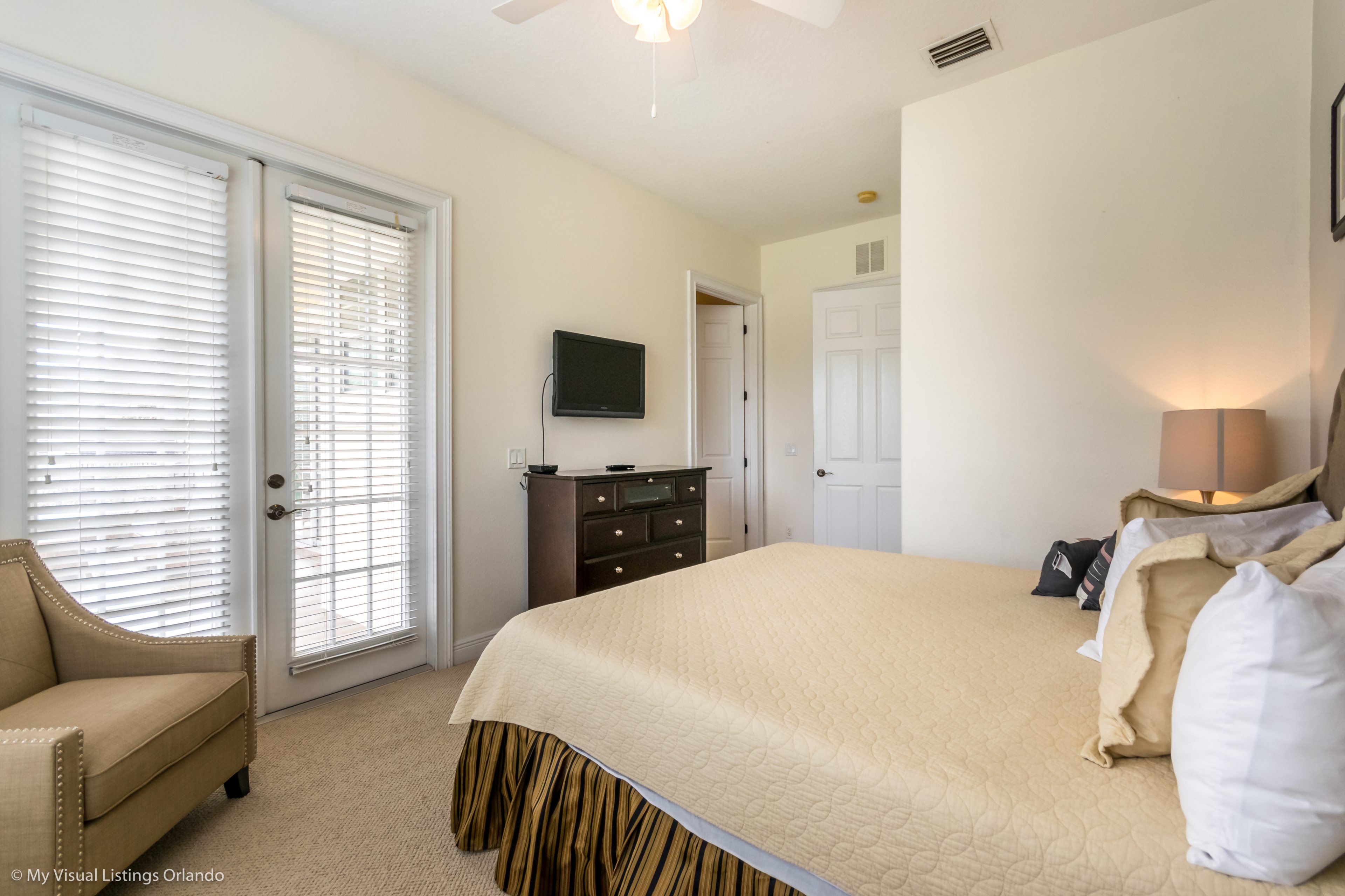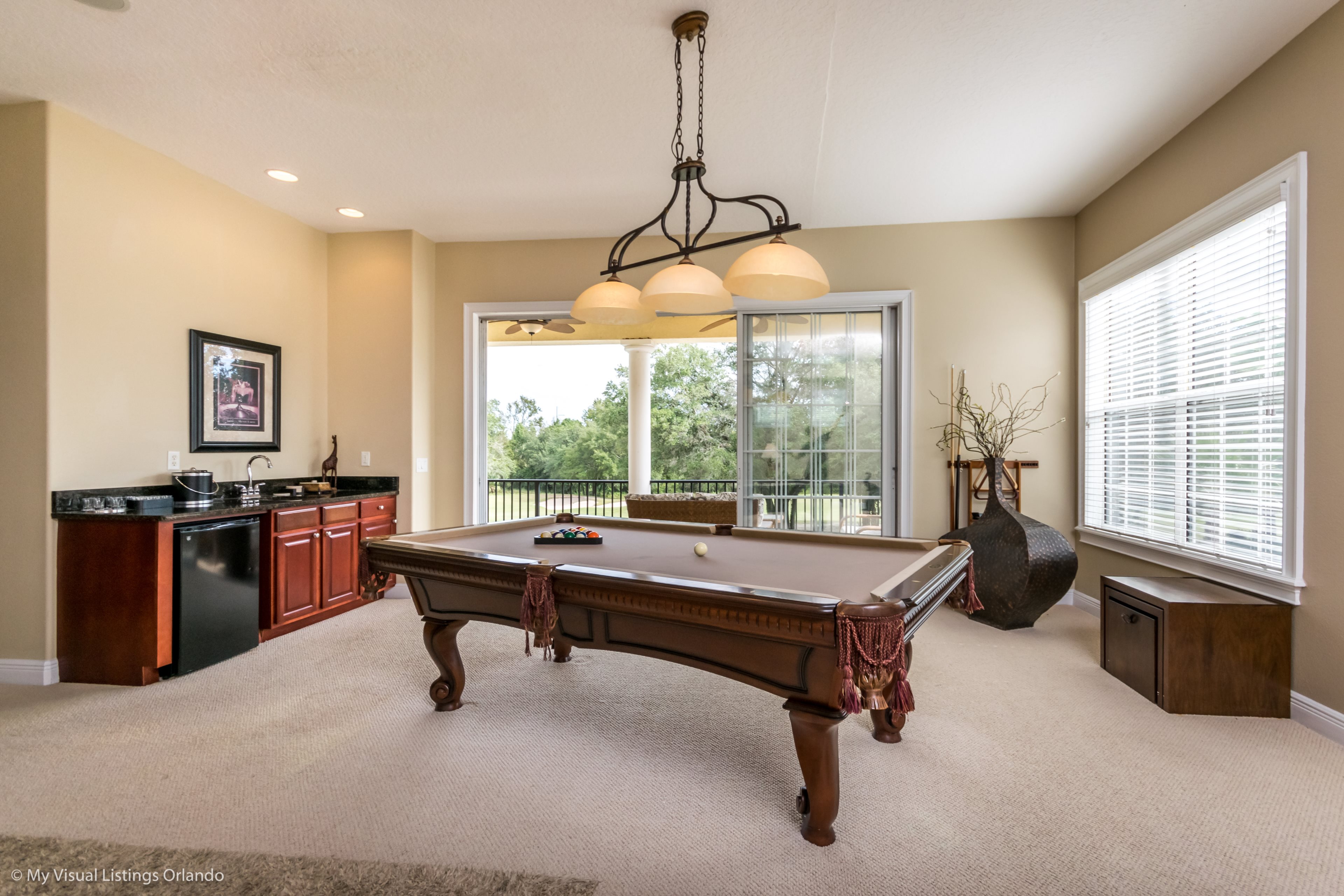 Upstairs is a large games room with comfortable sofas, pool table, large wall mounted TV complete with games console, and built in wet bar. Sliding doors access the rear balcony making this space a great space for family tournaments or simply relaxing and enjoying the great golf course views. The second king-size master has an ensuite bathroom with walk in shower. Two further bedrooms, one full size and the other having two twins share the family bathroom with a tub/shower combination.