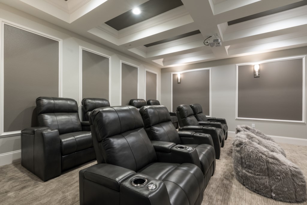 Movie Theater/Media room with 150 in screen, tiered seating, bean bag chairs, PS4 video game console with a library of games to choose from