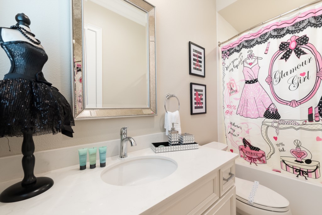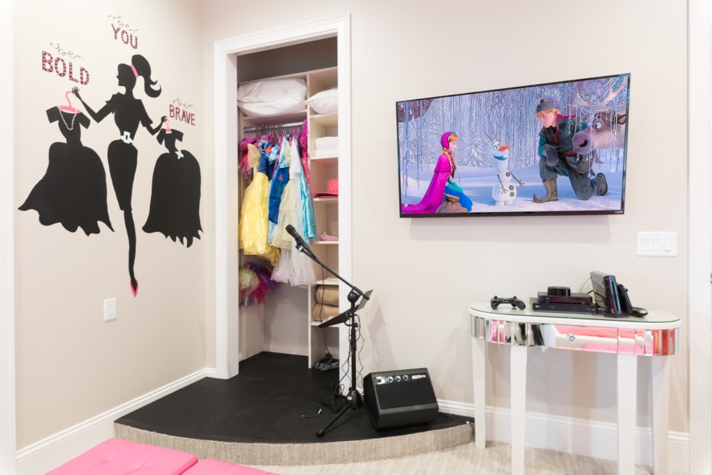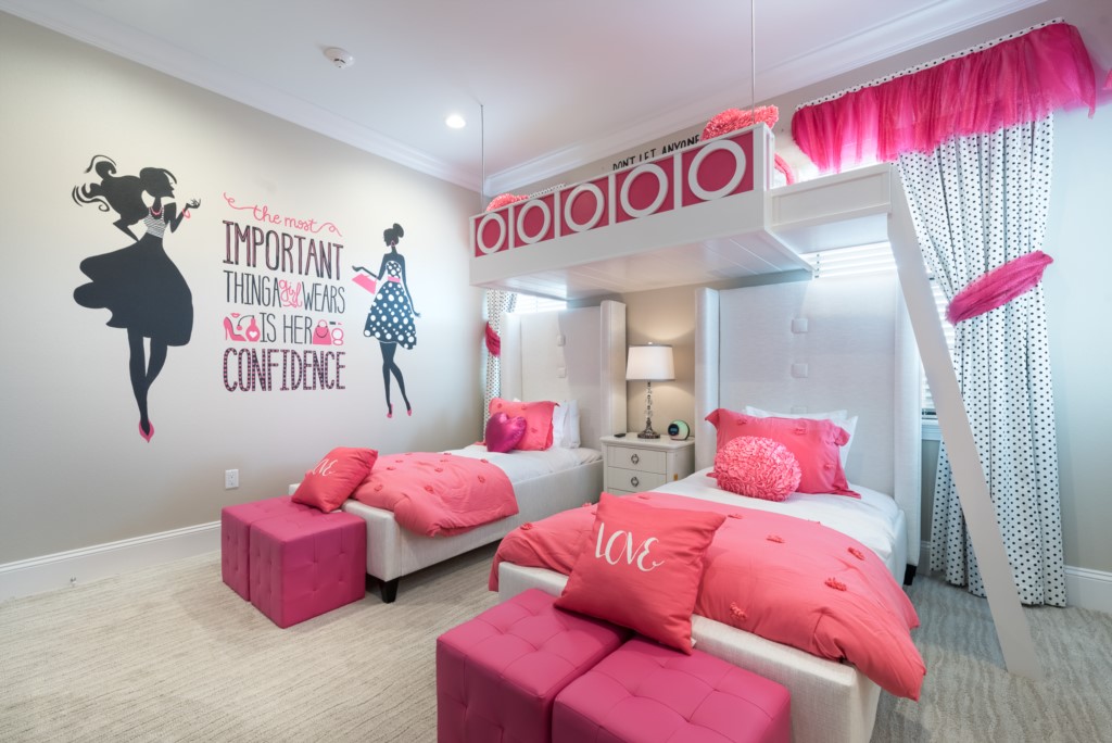 Girl's room "Glam" themed with a fun loft area, karaoke stage, and Wii game console - Sleeps 3 as a bunk bed (3x Full sized beds), en suite (shower)