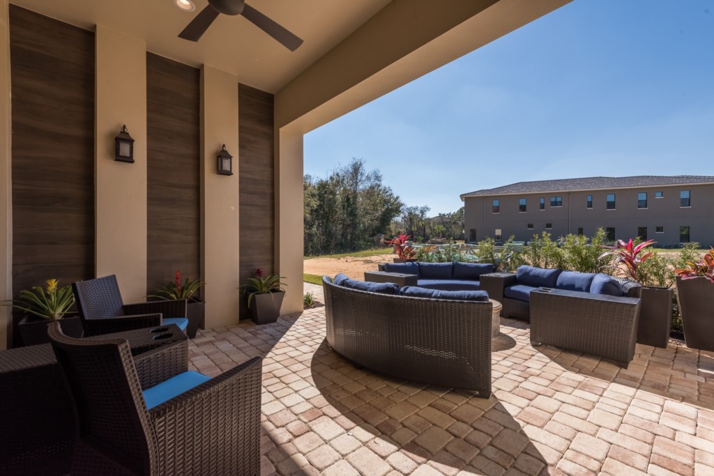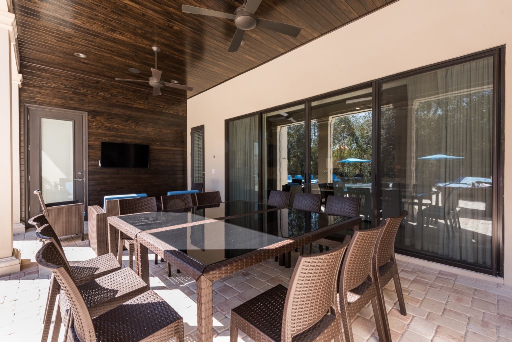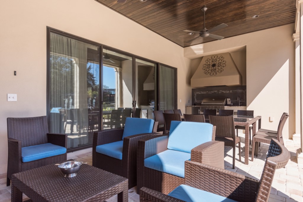 Summer kitchen and covered lanai with comfortable seating