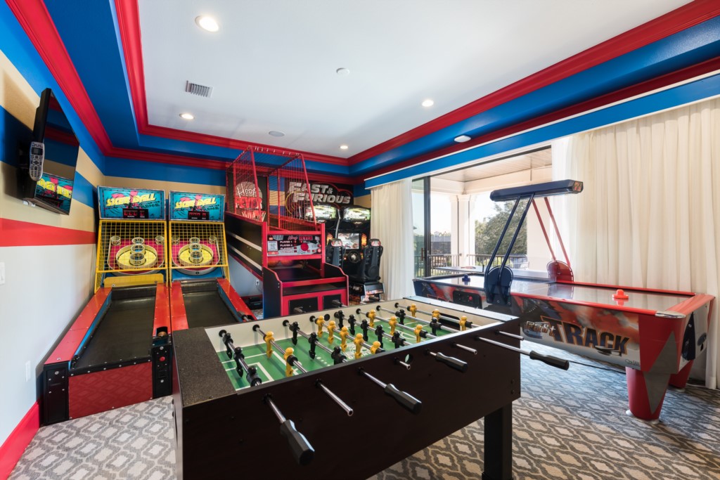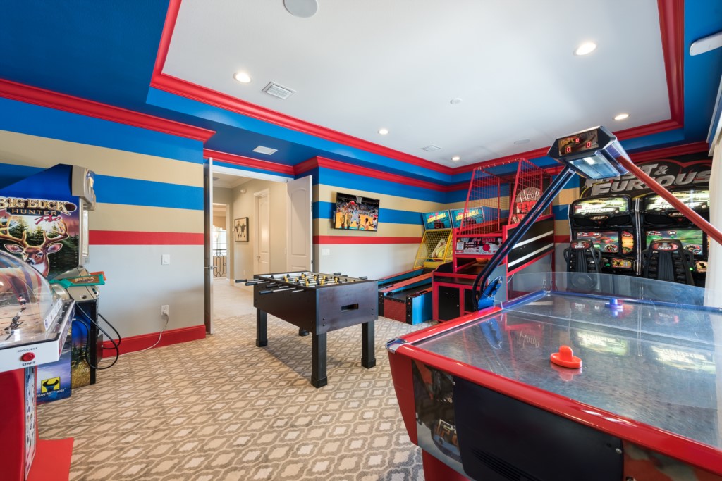 Stunning games area with Skee ball, Basketball "pop-a-shot", Foosball, Interactive arcade games, Bubble hockey, Poker table, and multiple video arcade games
