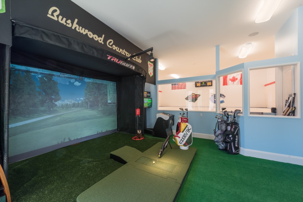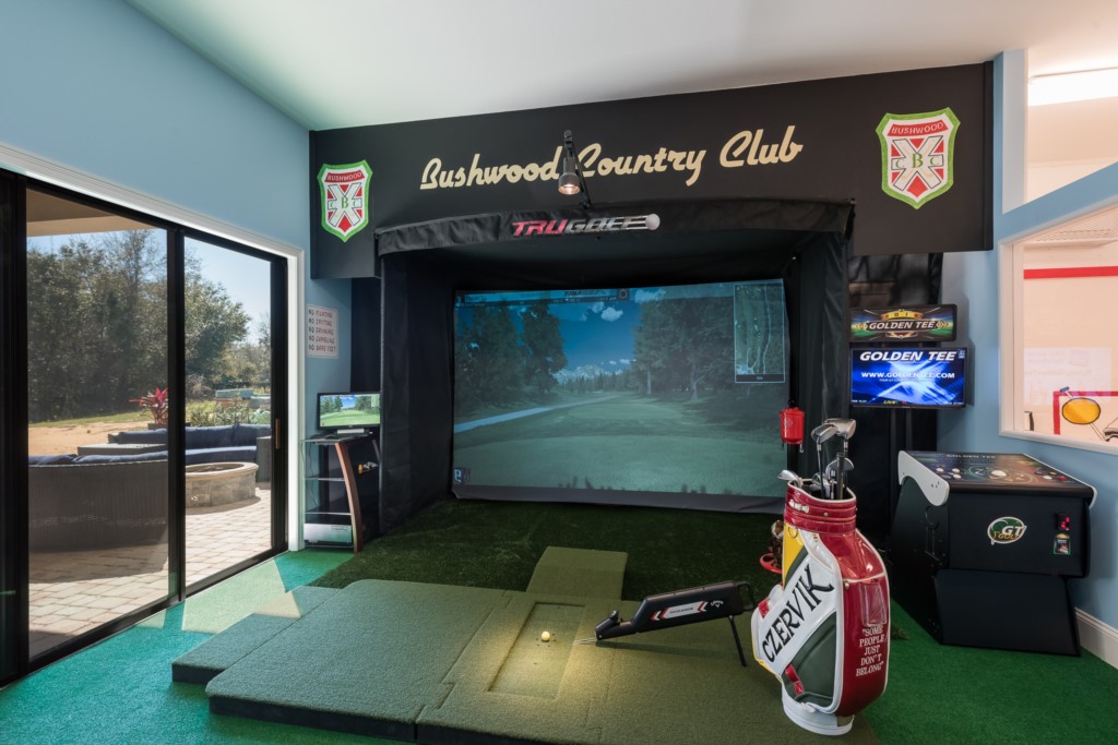 Completely finished and air conditioned garage with top of the line Golf simulator