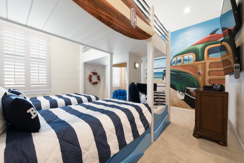 Boy's room "Surfer" themed with"dock" bunk beds, two TVs with PS4 and Wii video game console - Sleeps 4 (4x Full sized beds), en suite (shower)