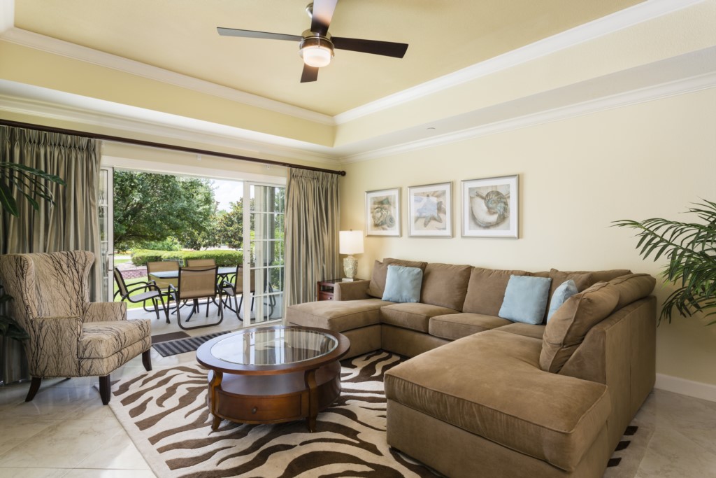 Comfortable, spacious lounge with a TV, sectional, and accent chair overlooking the green of the 13th hole through beautiful French doors