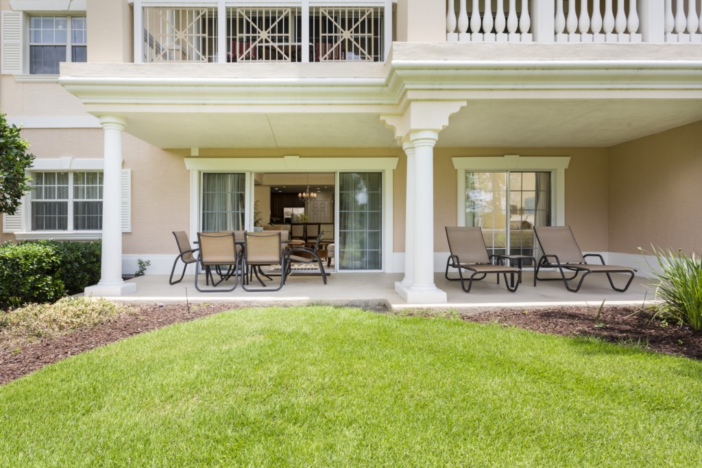 West facing terrace on the ground floor with a six seat patio table. Excellent views of the 13th hole over the Watson Independence PGA golf course