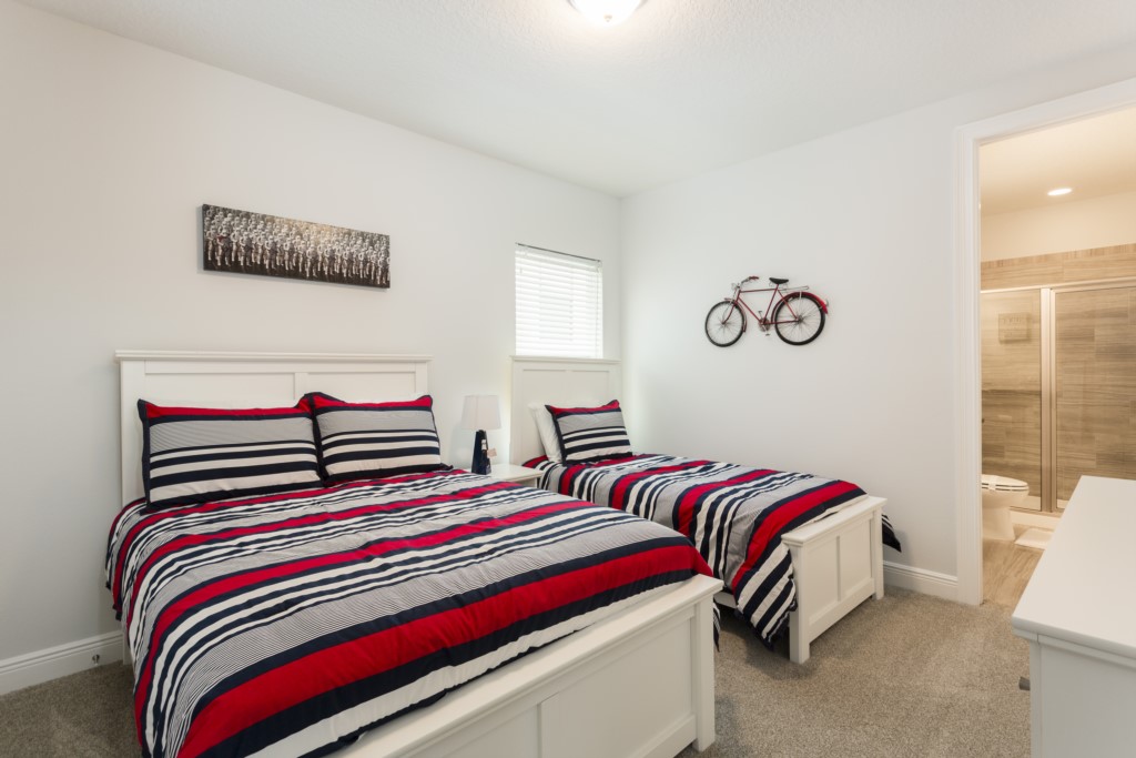 A bedroom with a Twin and Full sized bed and an en suite (shower)