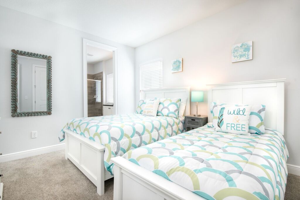 A bedroom with 2x Twin sized beds and an en suite (shower)