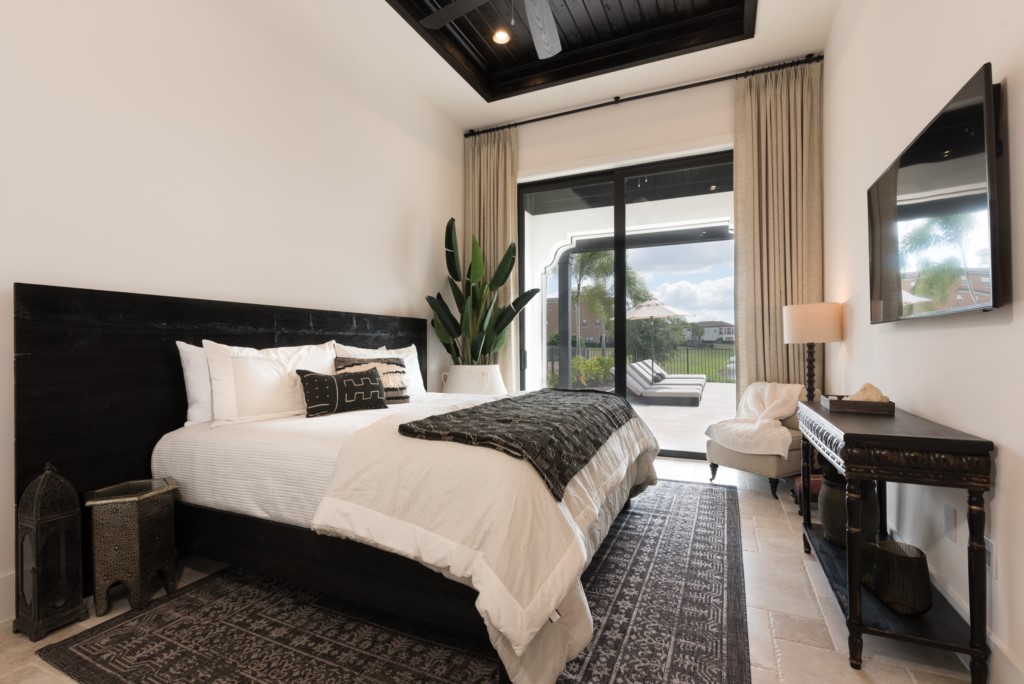 King sized first floor Master bedroom with lake view, sliding glass door access to private lanai sitting area, and en suite (twin vanities, walk-in shower)