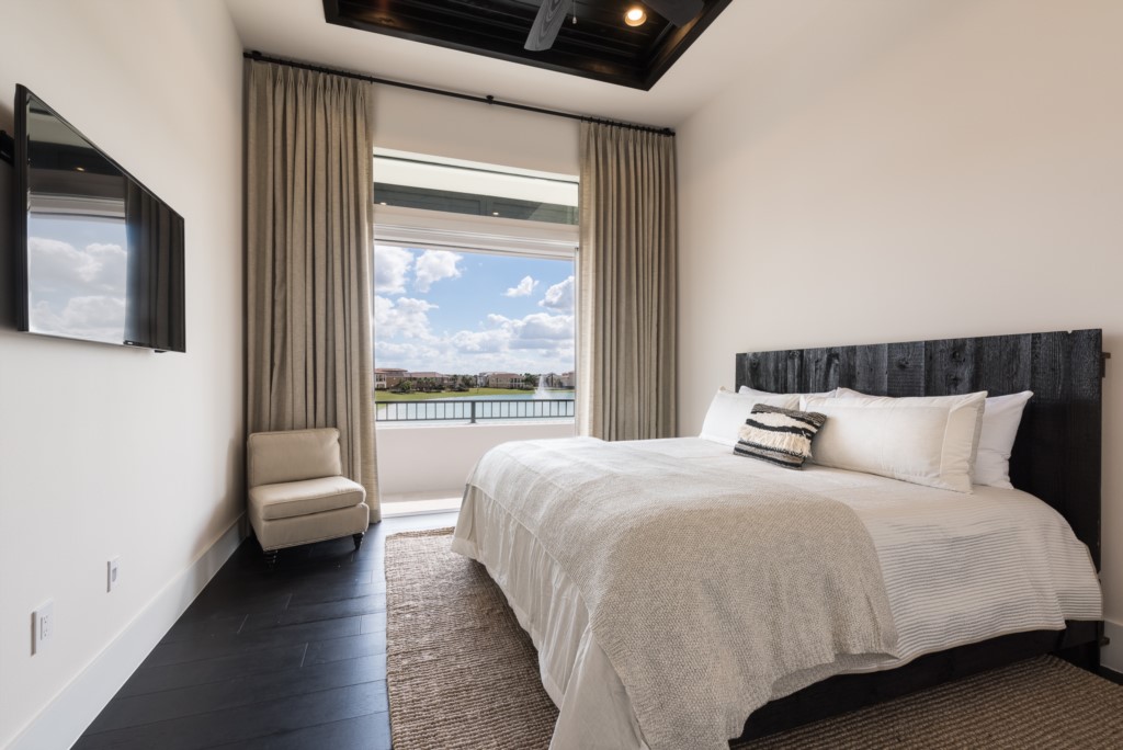 King sized bedroom with lake view on upper floor, sliding glass door access to upper lanai, and en suite (walk-in shower)
