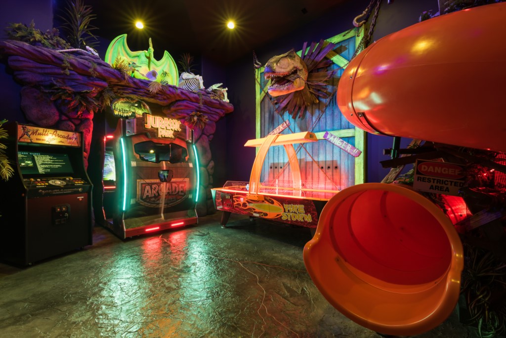 Dino Arcade is super-sized iwth a life size T-Rex, loads of arcade fun, and a full-size tube slide but can you find the slide entrance?!