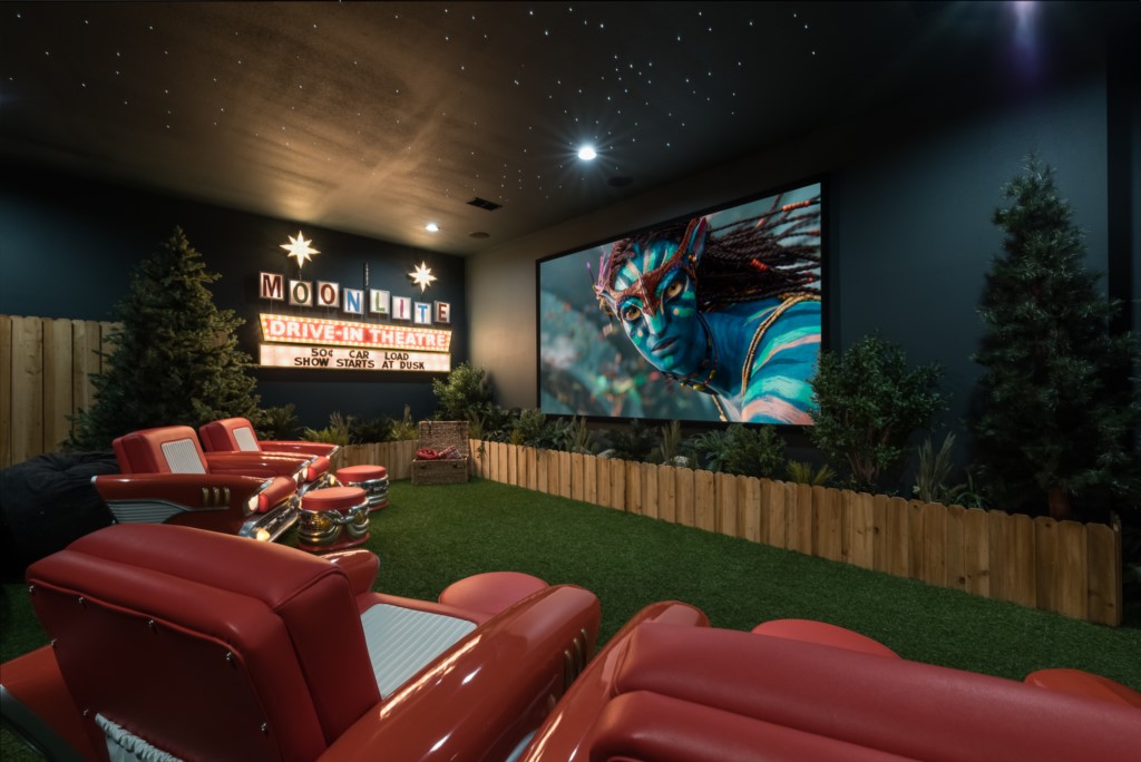 The “Drive-In” Theater features a Queen sized truck bed (no attached bathroom in this room), classic car sofa, and a projector entertainment system