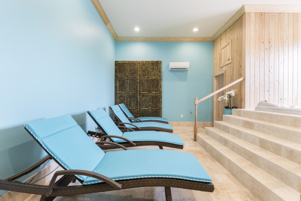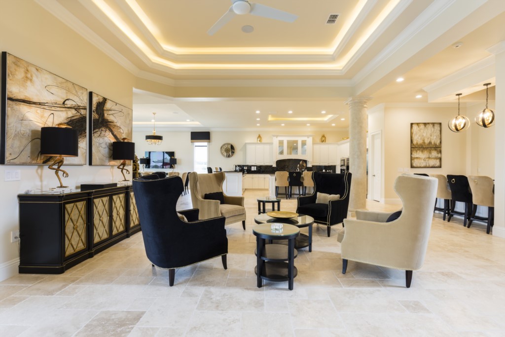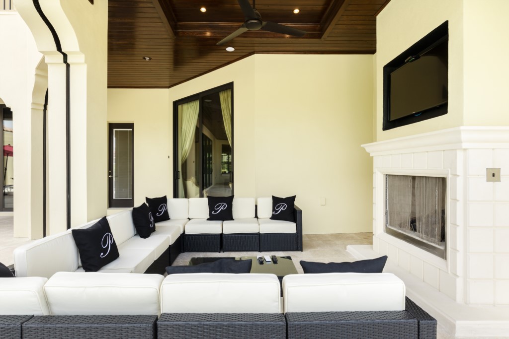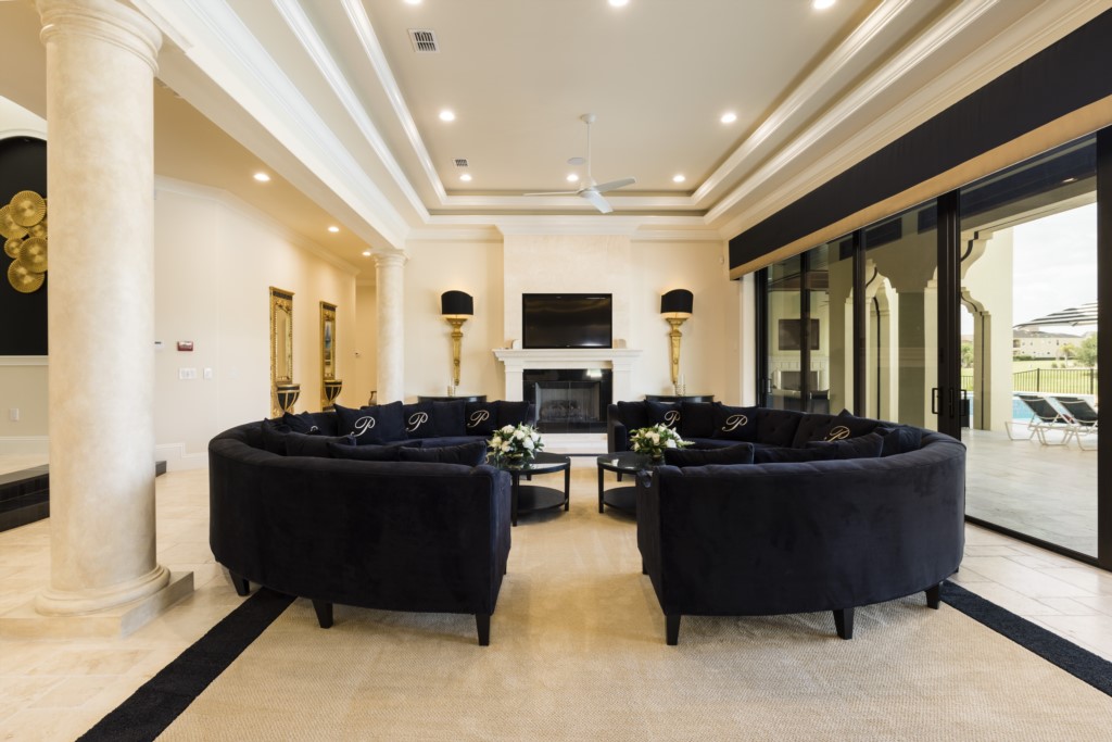 Spacious comfortable seating area with a large circular sofa, 4x accent chairs, and a feature fireplace overlooking the private pool deck through sliding glass doors