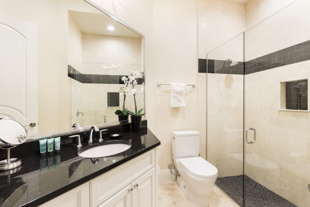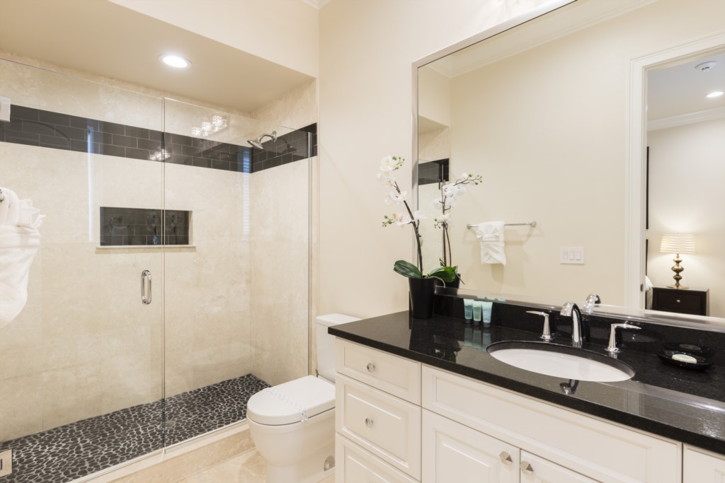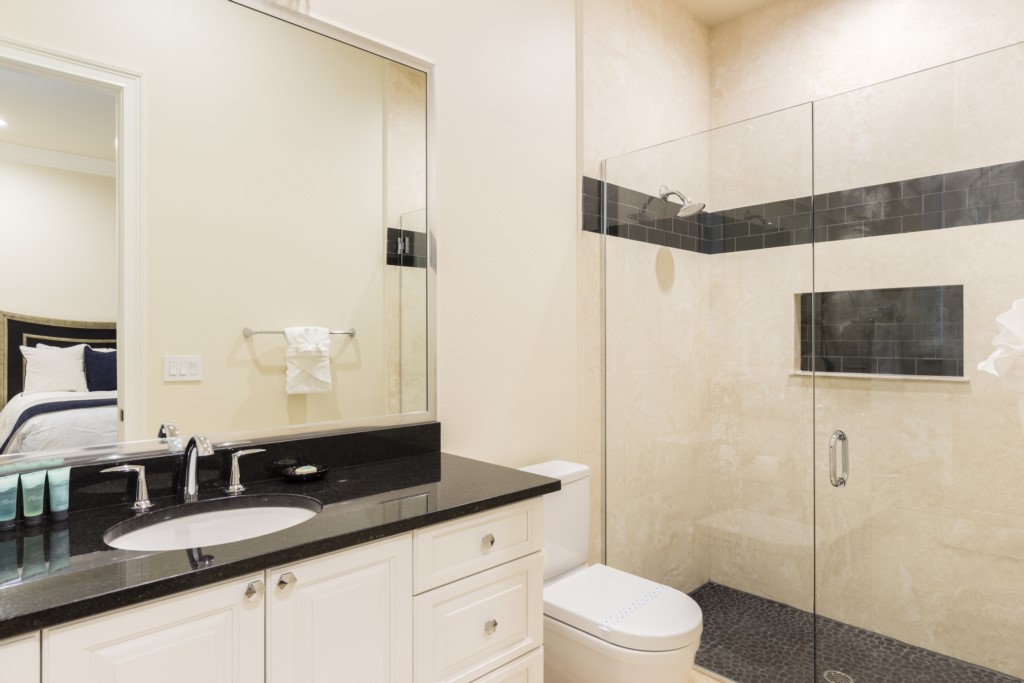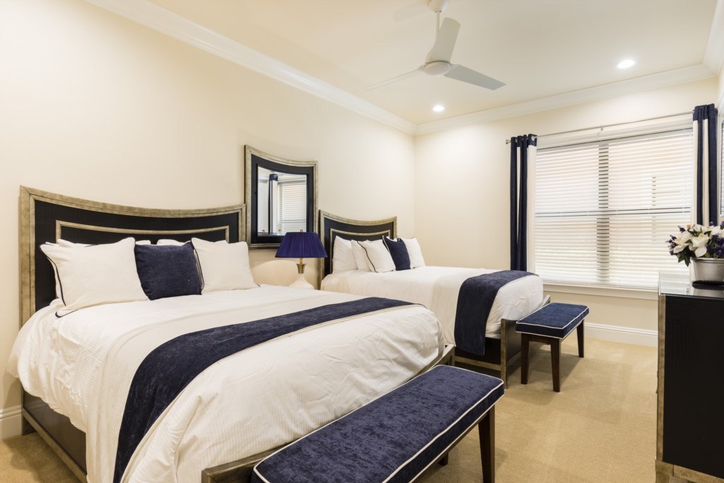 A bedroom with 2x Queen sized beds and an en suite (shower)