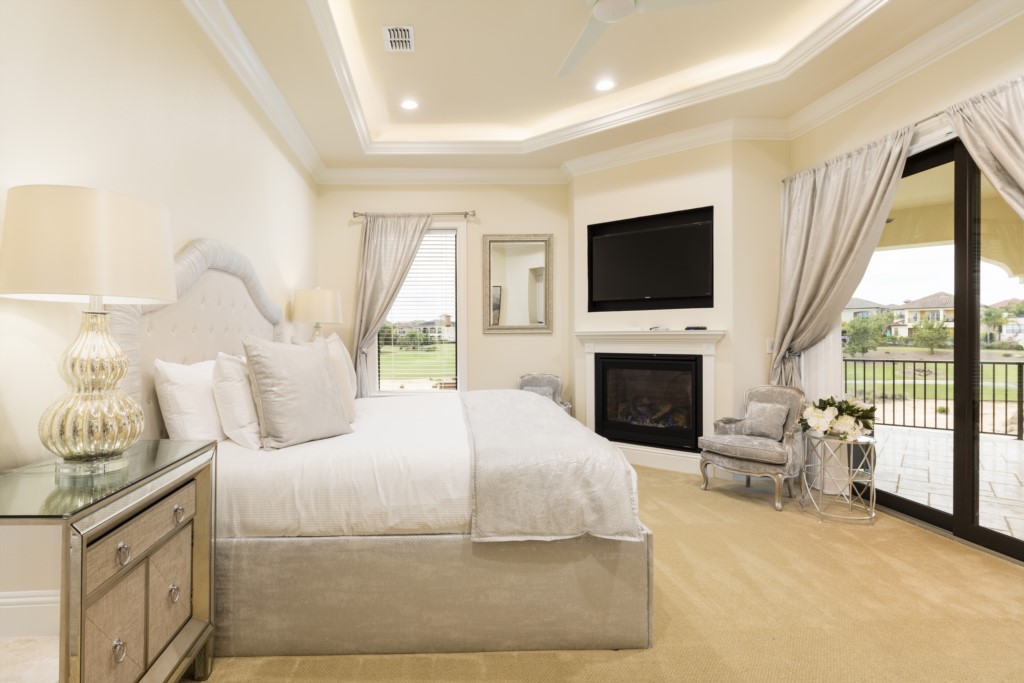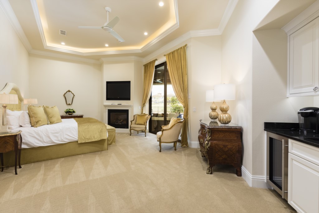 King sized Master with en suite (shower, tub, 2 separate vanities), feature fireplace, wet bar, walk in closet with vanity, balcony access over the pool deck