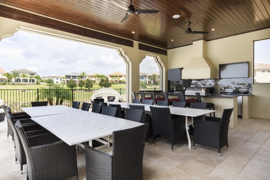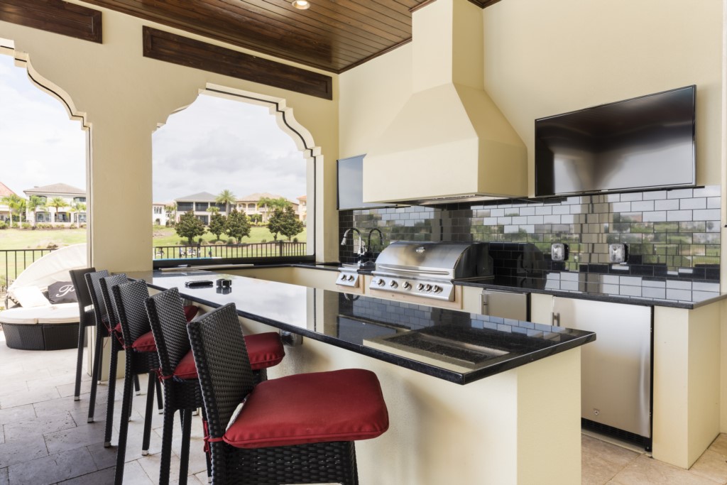 Summer kitchen with grill, 2x large flat screen TVs, and 6x high top chairs