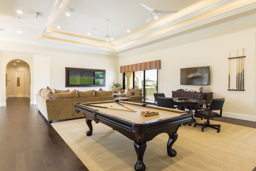 Upstairs loft area has a pool table, 4x large flat screen TVs with a PS4 and XBox One video game console, 4 seat card table, 2x accent chairs, sectional