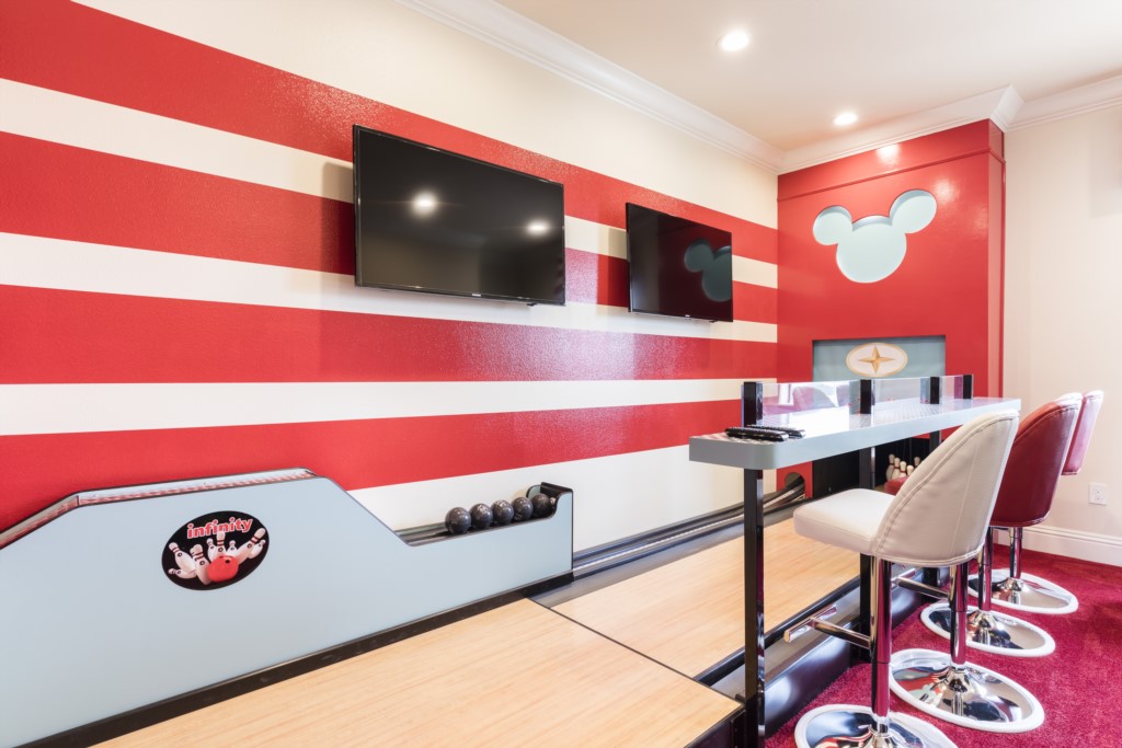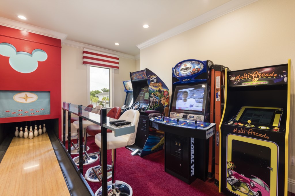 Mini bowling alley with 4x video arcade games as well as 4x high top chairs