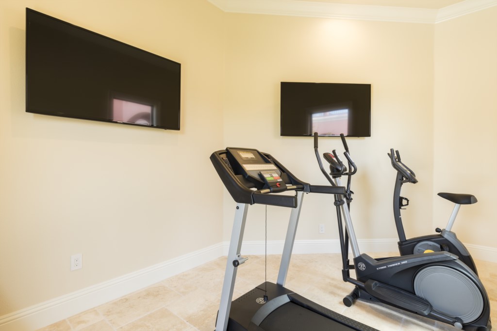 Gym has a treadmill and elliptical with 2x large flat screen TV's