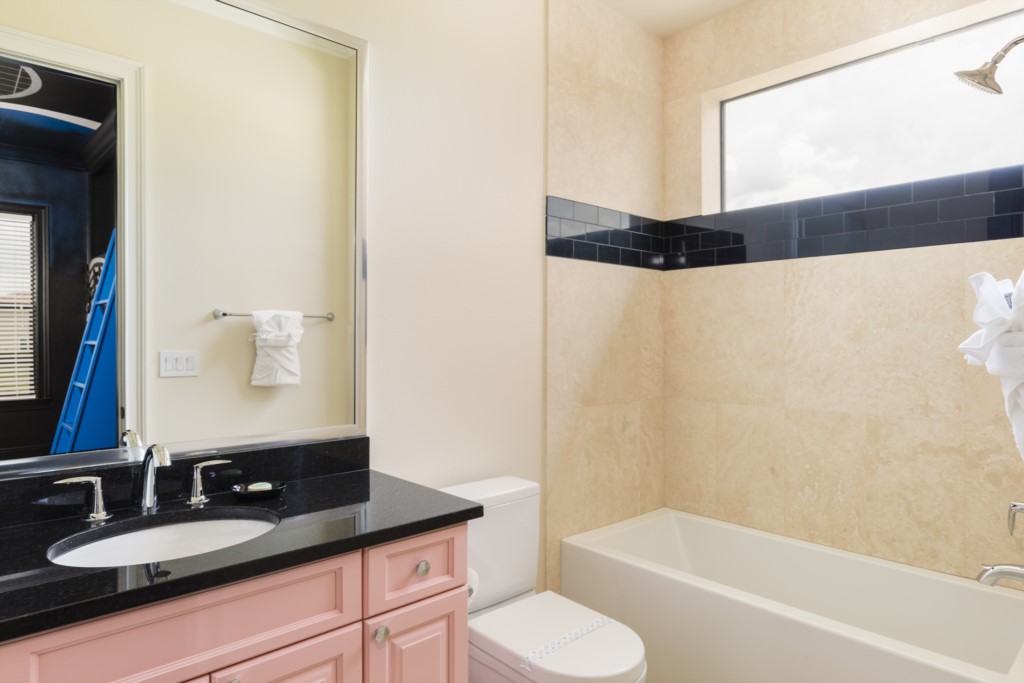 Karaoke themed bedroom with 2x sets of bunk beds (4x Full sized beds total) and an en suite (shower/bath combo)